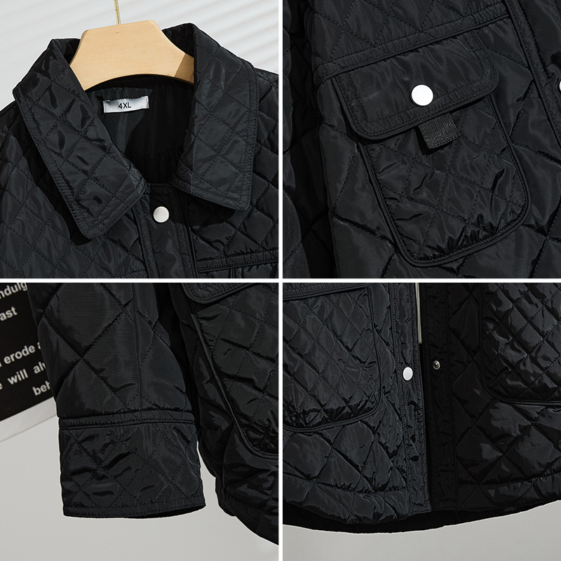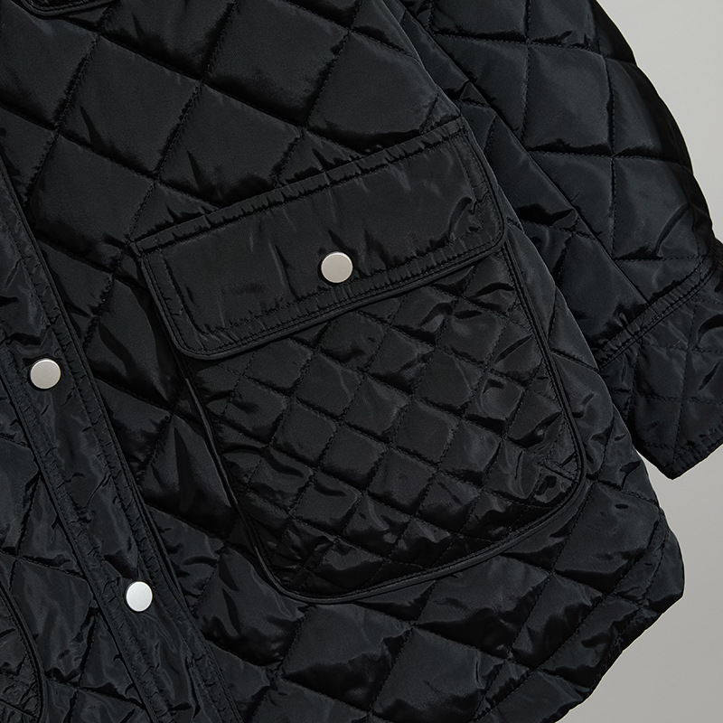 夹棉做菱形格压线工艺,填充的是羽绒棉,4个口袋都是真口袋,版型显瘦