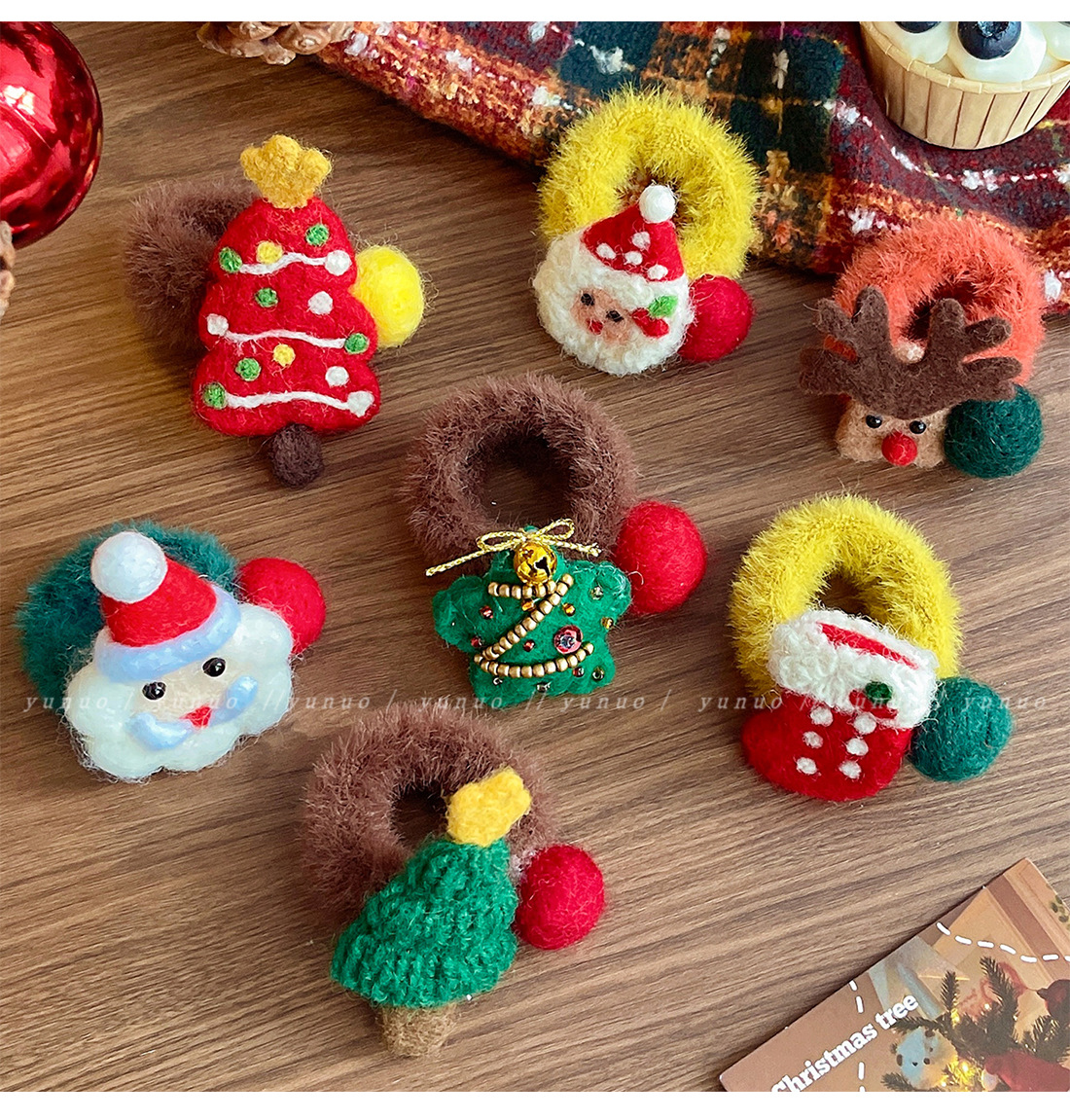 Брошь в виде елки с меховым шариком в лесном стиле; Модная фетровая брошь в виде рождественской елки; Современная красная брошь в виде тростника; Брошь в виде вышитого медведя с гирляндой; Зеленый Санта-Клаус (резинка для волос); Желтый Рождественский Санта (резинка для волос); Желтая подарочная коробка (резинка для волос); Желтые носки (резинка для волос); Коричневая пятиконечная звезда (резинка для волос); Коричневая и красная резинка для волос в виде рождественской елки; Оранжевый лось (резинка для волос); Оранжевая подарочная коробка (резинка для волос)