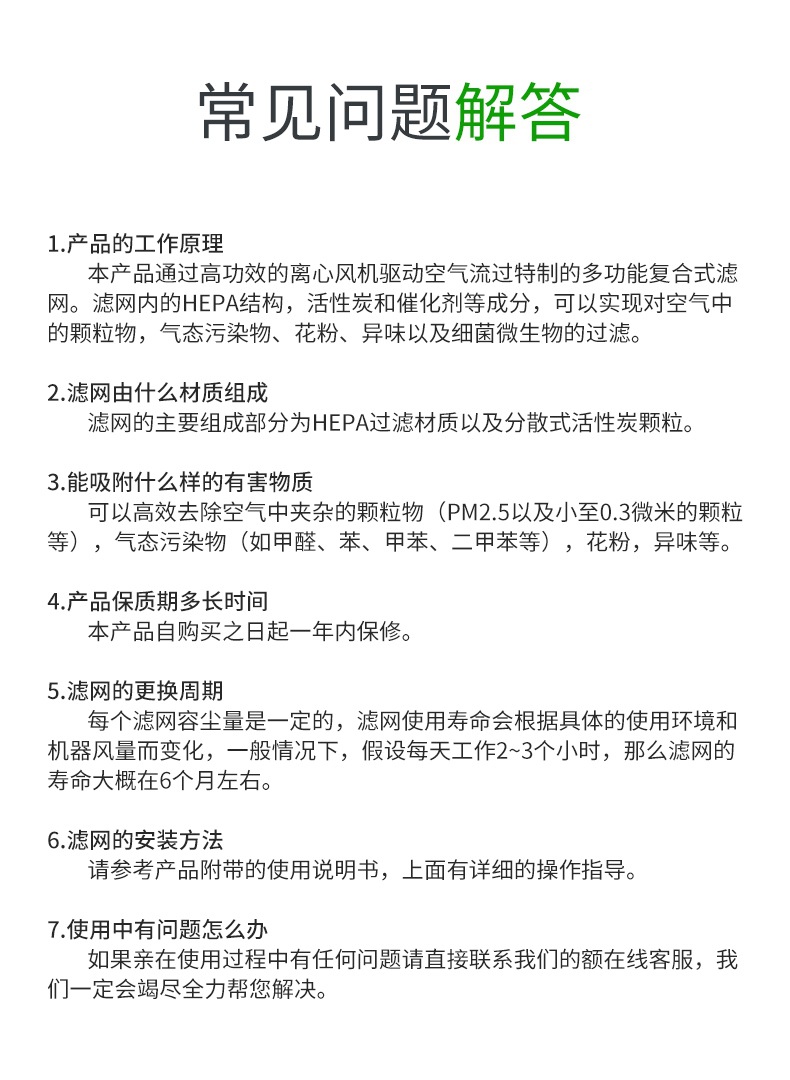 - 功能:消除异味 过滤灰尘 吸收TVOC气体