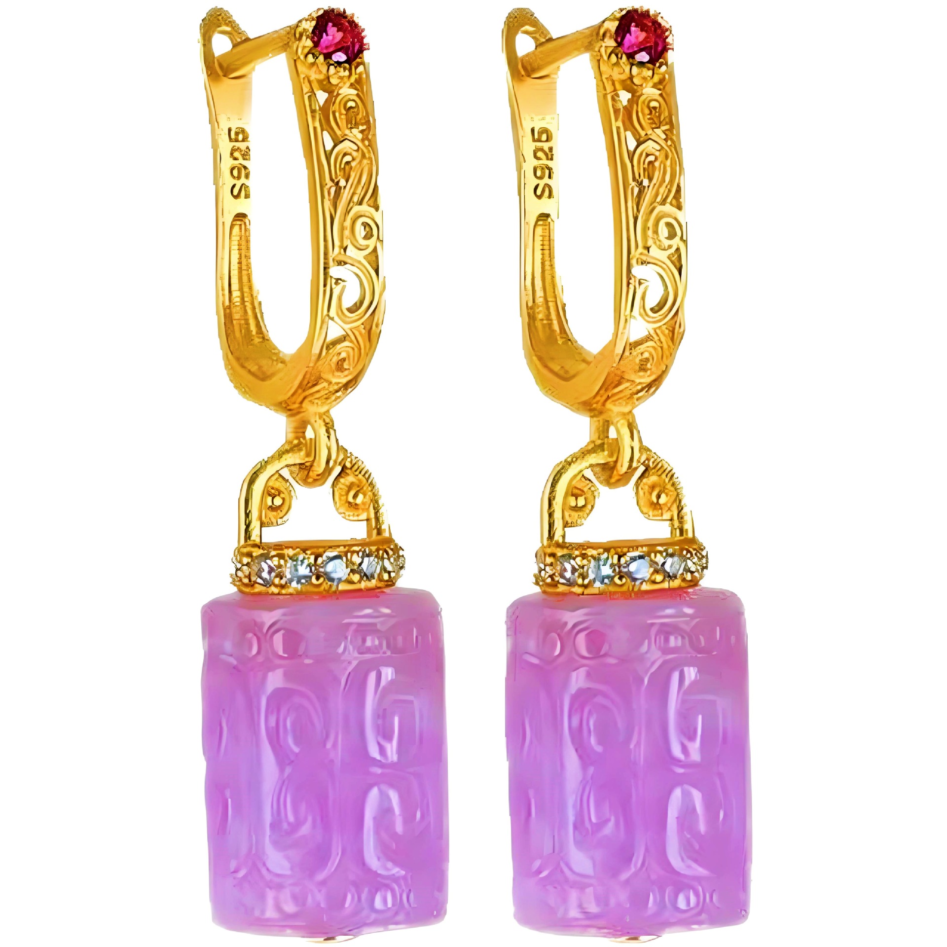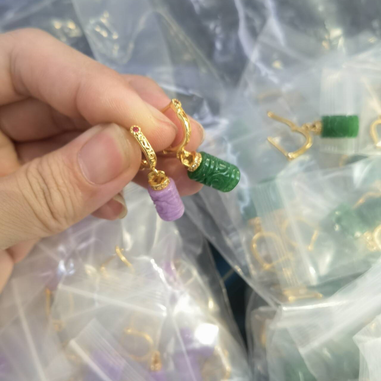 Пара сережек, рекомендованных владельцем, фиолетового цвета.; пара сережек зеленого цвета