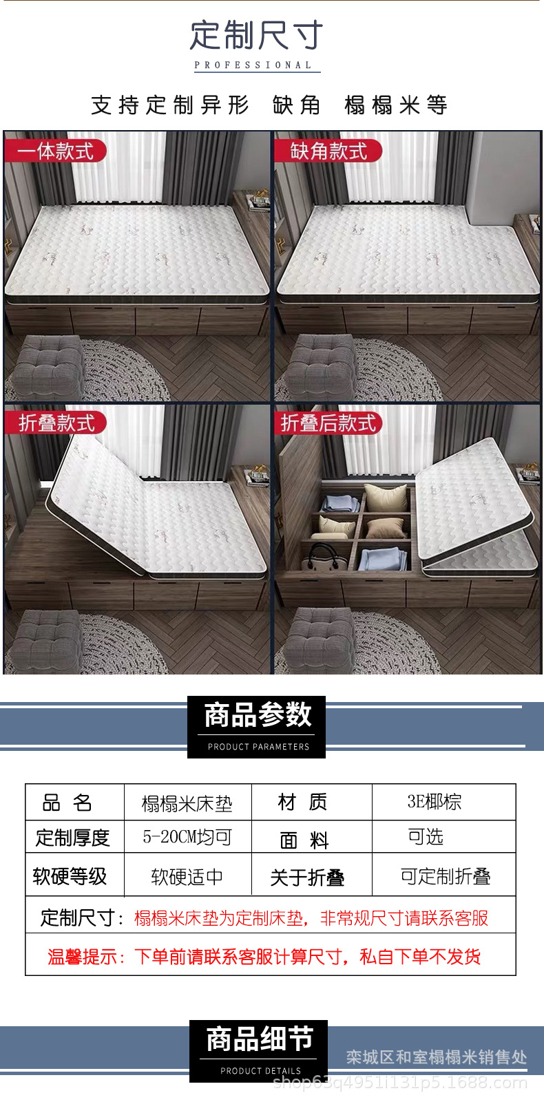 Твердость около 5 см (кокосовая пальма 3 см); Около 6 см твердый (включая 4 см кокосовой пальмы); Примерно 8 см, более плотная сторона (включает 6 см кокосовой койры).; Примерно 10 см, более плотная сторона (включает 8 см кокосовой койры).; 8 см умеренной мягкости и твердости (включая 2 см латекса); 10 см умеренной мягкости и твердости (включая 2 см латекса); 15 см умеренной мягкости и твердости (включая 2 см латекса); Для получения дополнительных размеров, пожалуйста, свяжитесь со службой поддержки клиентов