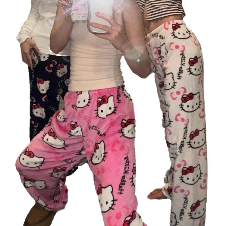Мультяшный кот фланелевые корейские пижамы женские осенние и зимние коралловые бархатные толстые теплые повседневные брюки можно носить на улице