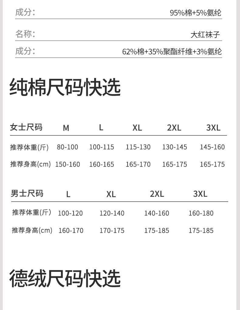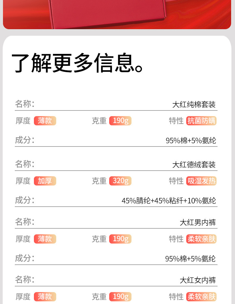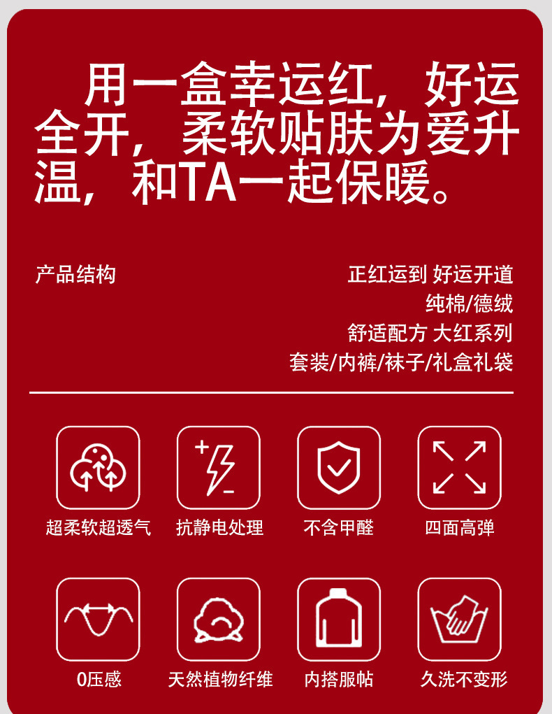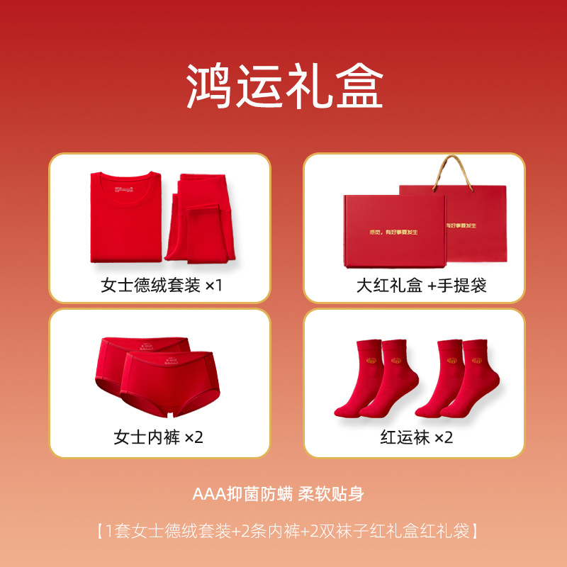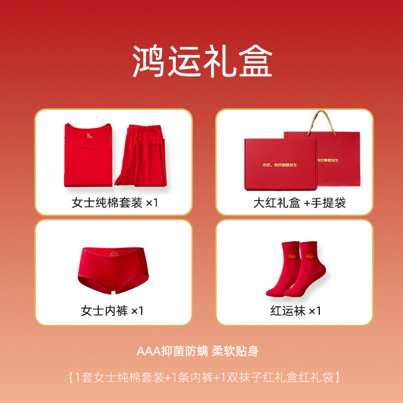 Женский костюм из чистого хлопка Happy (тонкий стиль); Мужской костюм из чистого хлопка, всего наилучшего (тонкий фасон); Женский комплект из чистого хлопка + 1 пара нижнего белья + 1 пара красных носков с цветами и полнолунием (тонкий фасон); Мужской комплект из чистого хлопка + 1 пара нижнего белья + 1 пара красных носков на удачу в жизни (тонкий фасон); Женский комплект из чистого хлопка + 2 пары нижнего белья + 2 пары красных носков, всегда улыбающийся (тонкий фасон); Мужской комплект из чистого хлопка + 2 пары нижнего белья + 2 пары красного, все идет хорошо (тонкий фасон); Женский бархатный костюм, все идет хорошо; Мужской бархатный костюм, счастливая звезда ярко сияет; Женский бархатный чехол + 1 пара нижнего белья + 1 пара красных носков, удачи.; Мужской бархатный чехол + 1 пара нижнего белья + 1 пара красных носков, все будет удачно; Женский бархатный чехол + 2 пары нижнего белья + 2 пары красных носков, безопасно каждый год.; Мужской бархатный чехол + 2 пары нижнего белья + 2 пары красных носков, идеально.