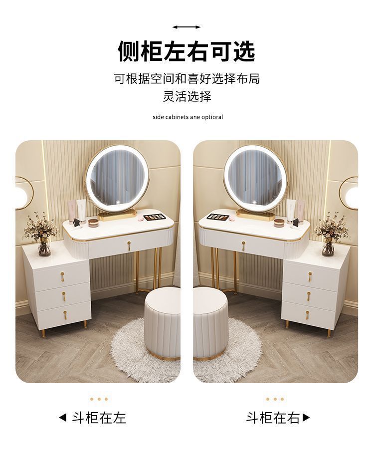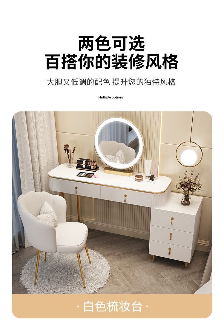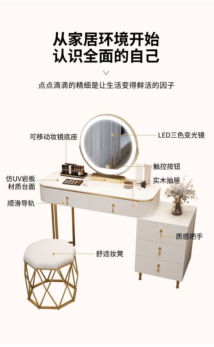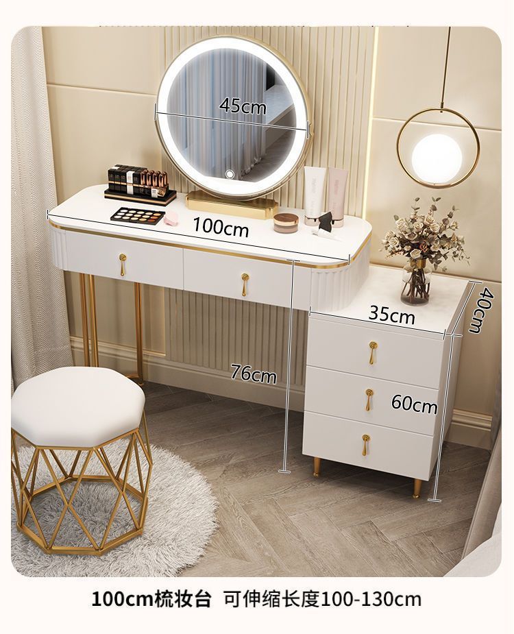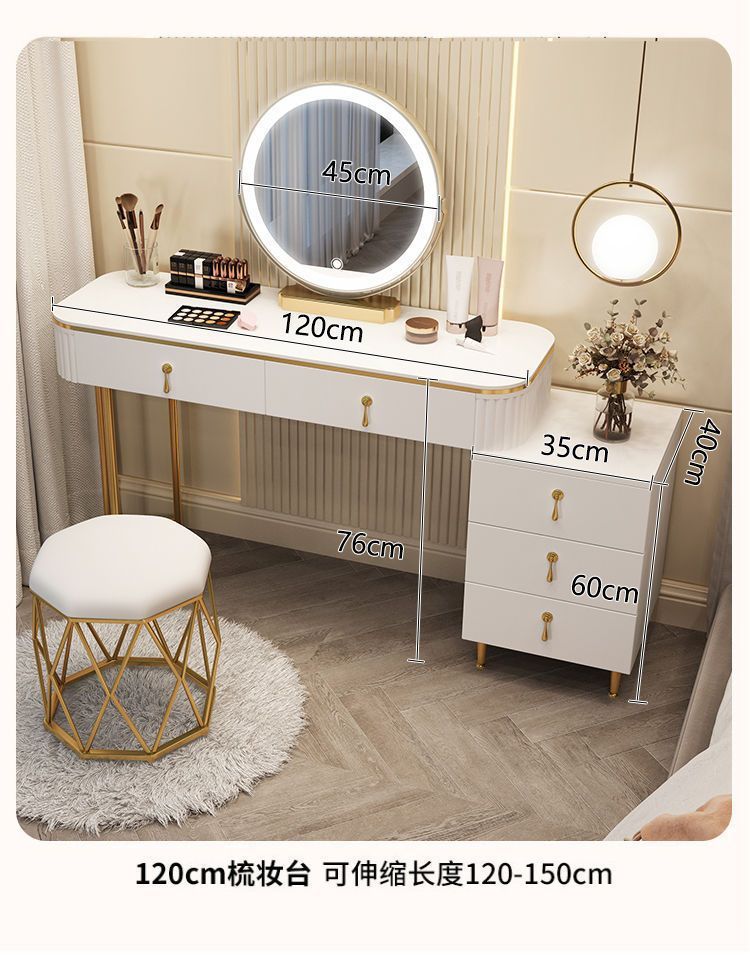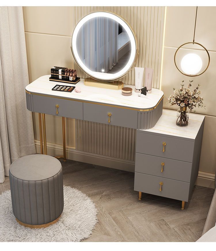 С табуретом для макияжа, с шкафом, с зеркалом, можно толкать и тянуть, выдвижной.