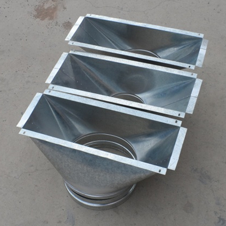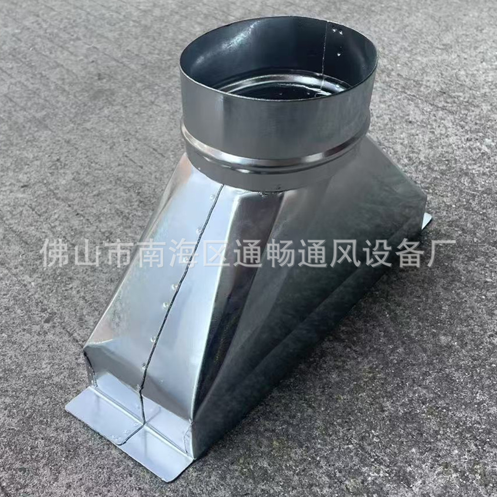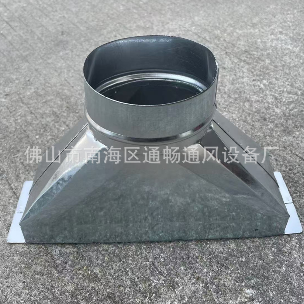 Выход выхлопного воздуховода меняется с квадратного на круглый. Воздуховод с переменным диаметром меняется с круглого на выходной. Оцинкованный железный воздуховод.