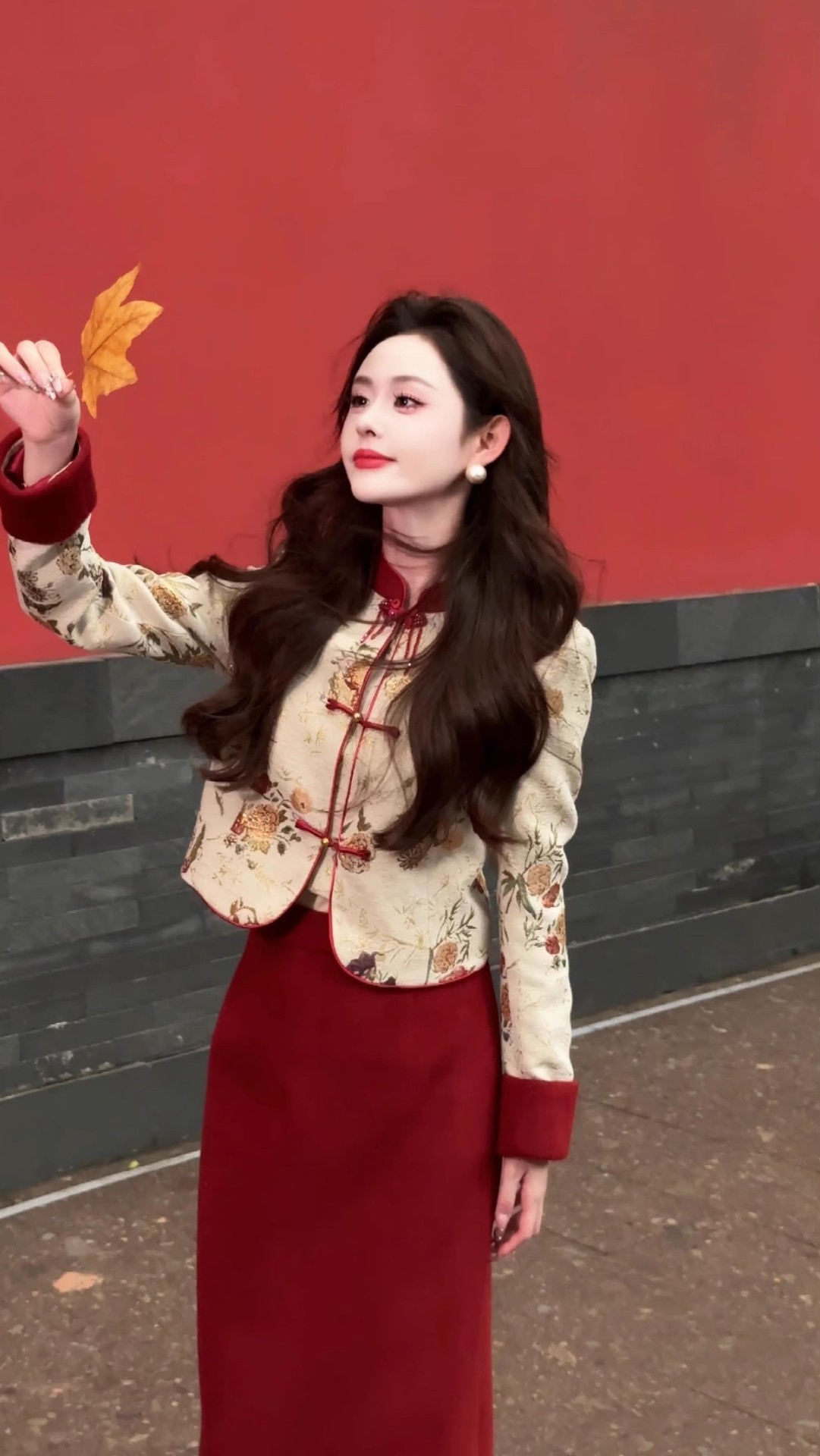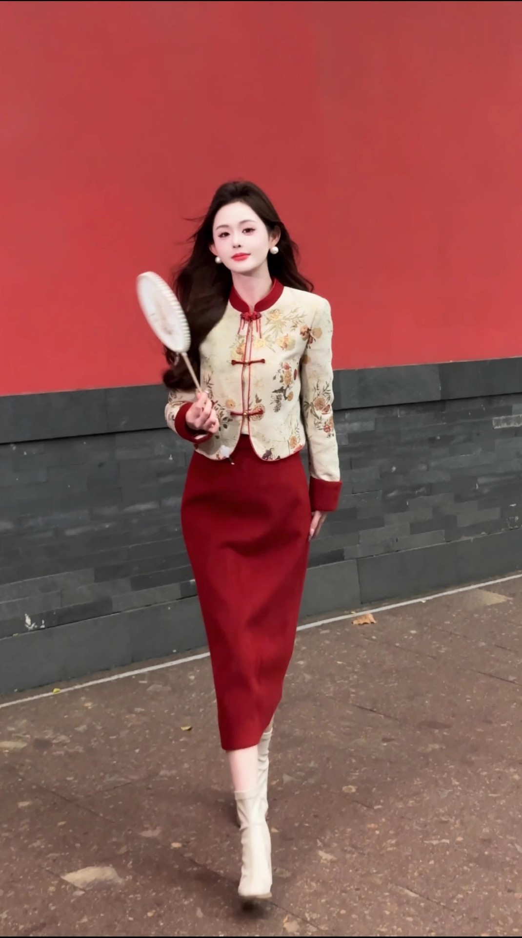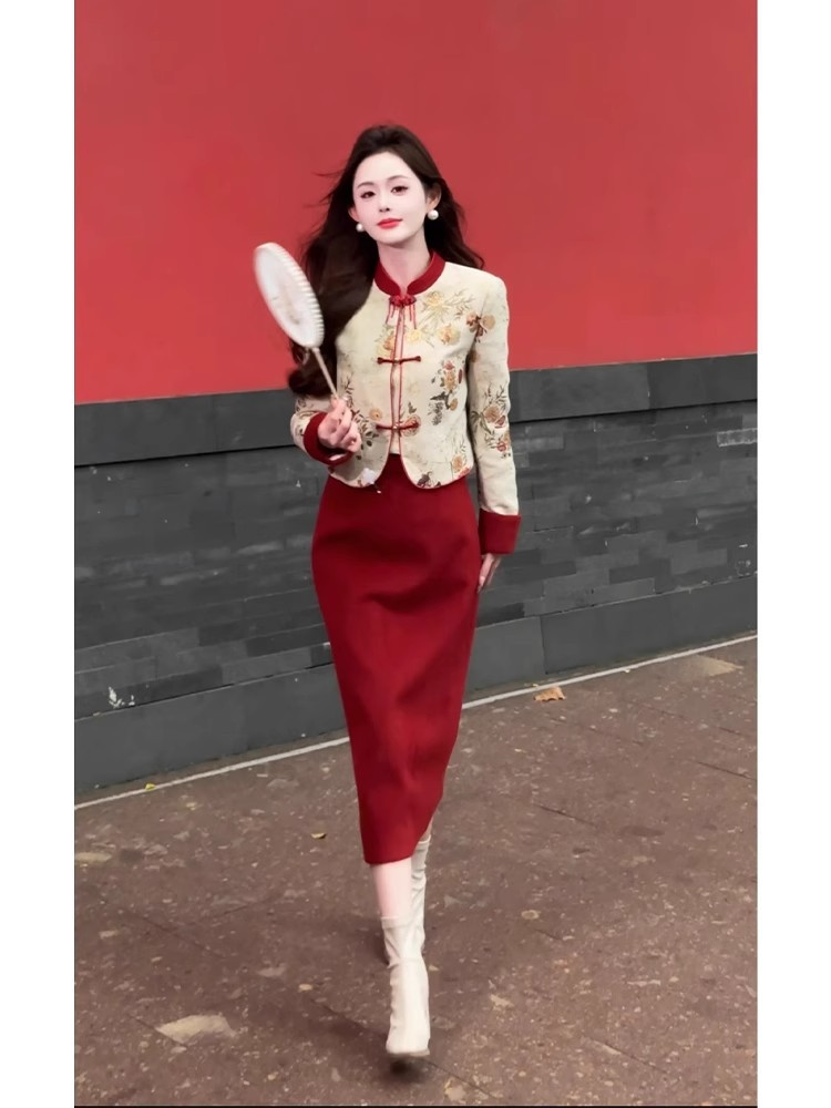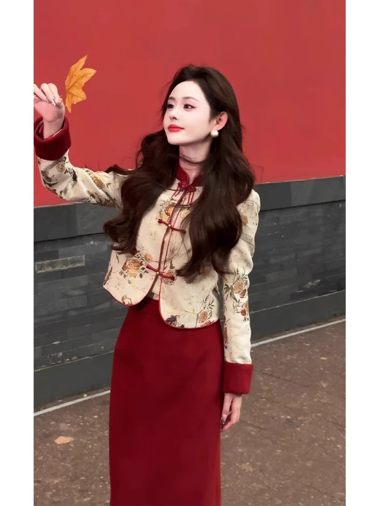 Новый китайский стиль ретро праздничный красный чонсам юбка костюм женский осенний и зимний национальный стиль вышивка хлопчатобумажная куртка юбка