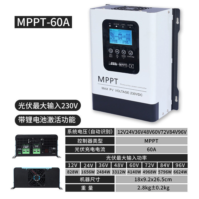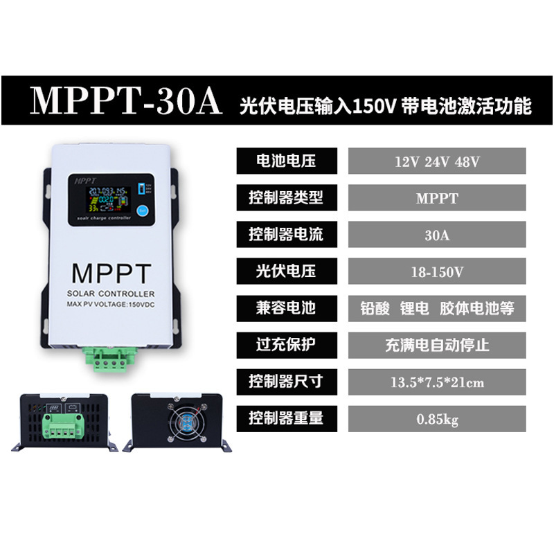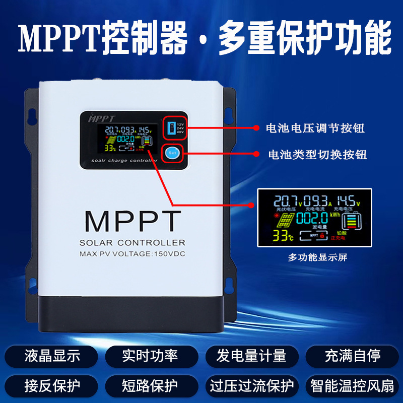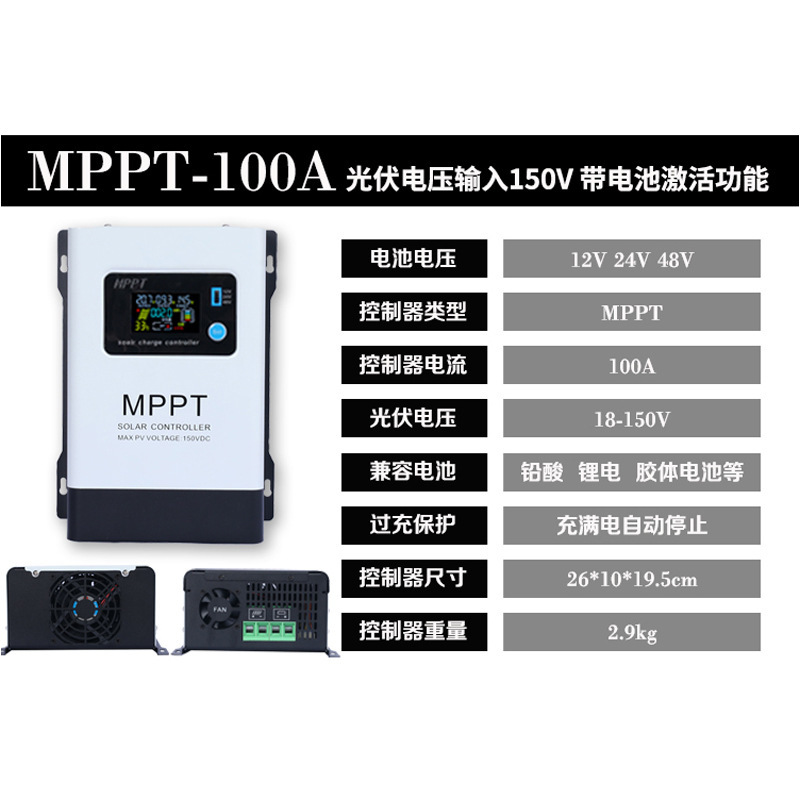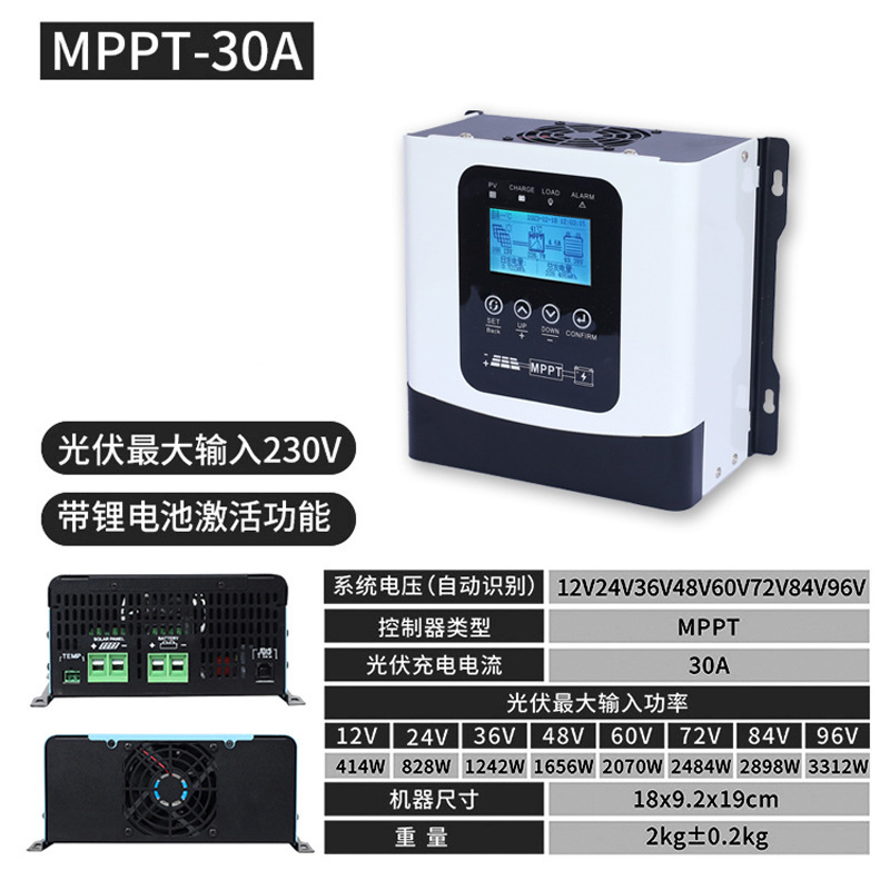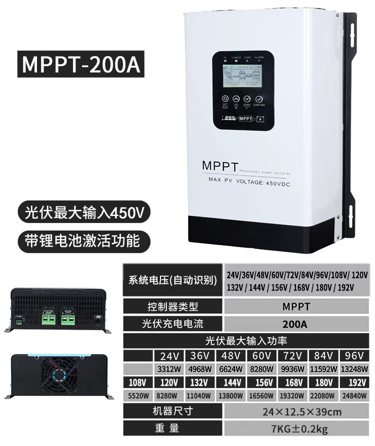 MPPT30A (универсальный 12–48 В) поддерживает фотоэлектрический вход 150 В.; MPPT60A (универсальный 12–48 В) поддерживает фотоэлектрический вход 150 В.; MPPT100A (универсальный 12–48 В) поддерживает фотоэлектрический вход 150 В.; MPPT-30A (универсальный 12–96 В) поддерживает фотоэлектрический вход 230 В.; MPPT-60A (универсальный 12–96 В) поддерживает фотоэлектрический вход 230 В.; MPPT-120A (универсальный 12–96 В) поддерживает фотоэлектрический вход 230 В.; MPPT-200A (универсальный 24В-192В) поддерживает входное напряжение фотоэлектрических панелей до 450В