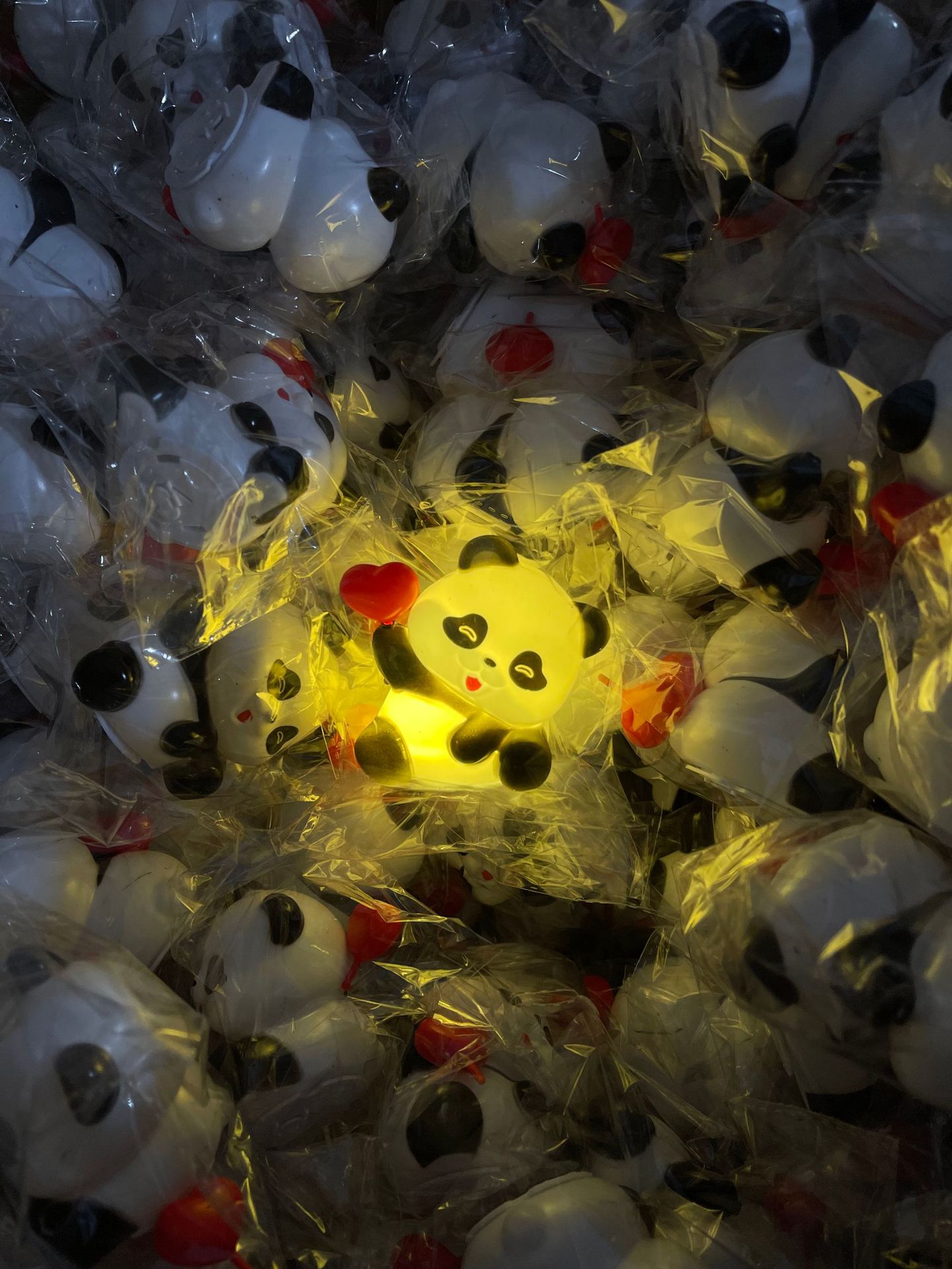 Виниловая сидящая панда с подсветкой; Виниловая лежащая панда; Виниловая панда из бамбуковых побегов с подсветкой; Виниловая панда в виде листьев лотоса с подсветкой; Виниловая желтая шапка панды-с подсветкой; Пластиковая панда с подсветкой