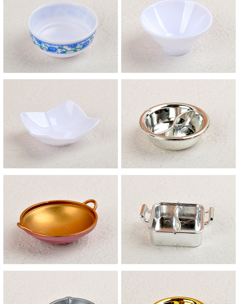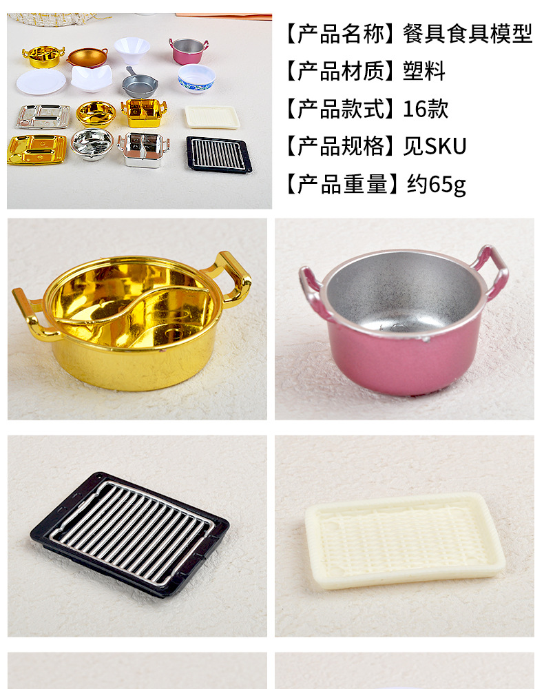 Круглая тарелка диаметром 5,5 см.; Четырехугольная овощная тарелка; Золотой горшок с уткой-мандаринкой; Серебряный горшок с уткой-мандаринкой; Горячая кастрюля с золотой круглой ручкой; Серебряная кастрюля с круглой ручкой; золотой квадратный горячий горшок; Серебряный квадратный горшок; золотой сухой горшок; серебряный сухой горшок; Чаша из искусственного синего и белого фарфора диаметром 4 см.; Белая миска для лапши удон диаметром 4 см.; черная сковорода; серебристо-серая сковорода; золотая закусочная тарелка; серебряная тарелка для закусок; черная форма для выпечки; бежевый поднос; ложка 4 см; белые палочки для еды; суповая кастрюля