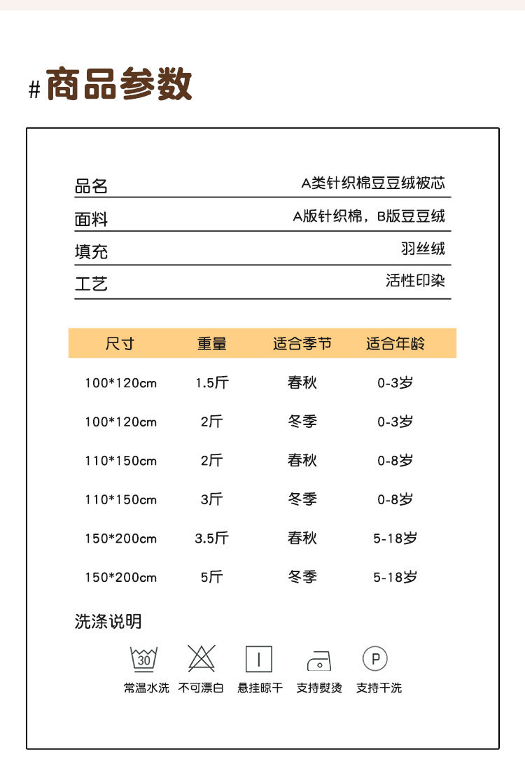 Весеннее и осеннее одеяло 100x120 см 0.75kg; Зимнее одеяло 100x120 см 1.0kg; Весеннее и осеннее одеяло 110x150 см 1.0kg; Зимнее одеяло 110х150 см 1.5kg; Весеннее и осеннее одеяло 150x200 см 1.8kg; Зимнее одеяло 150х200 см 2.5kg