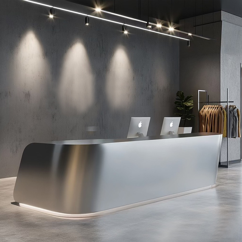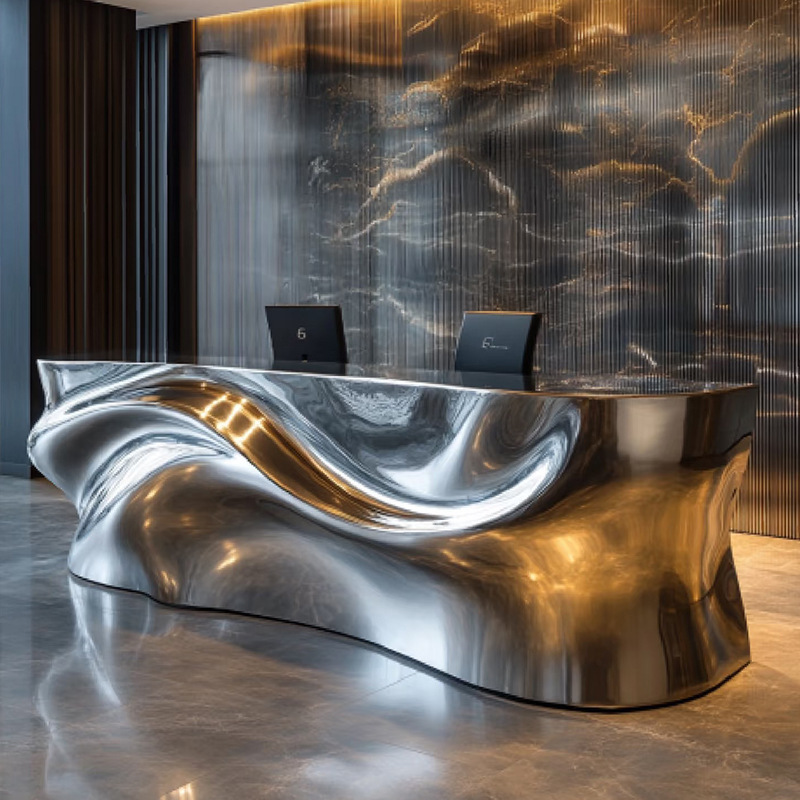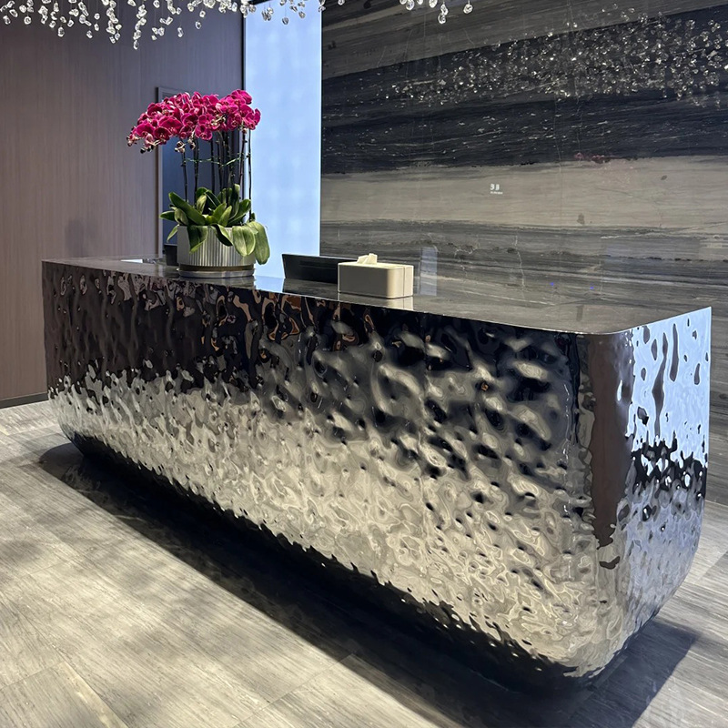 Бар специальной формы из нержавеющей стали, вестибюль отеля, стойка регистрации, ресторан, стойка регистрации, свет красоты, роскошный остров, комбинированный стол