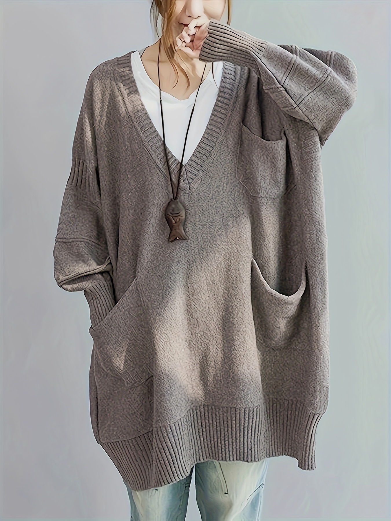 Популярный стиль Amazon: свободный свитер-платье с V-образным вырезом, длинными рукавами и средней длины, верхняя одежда для тихого стиля.