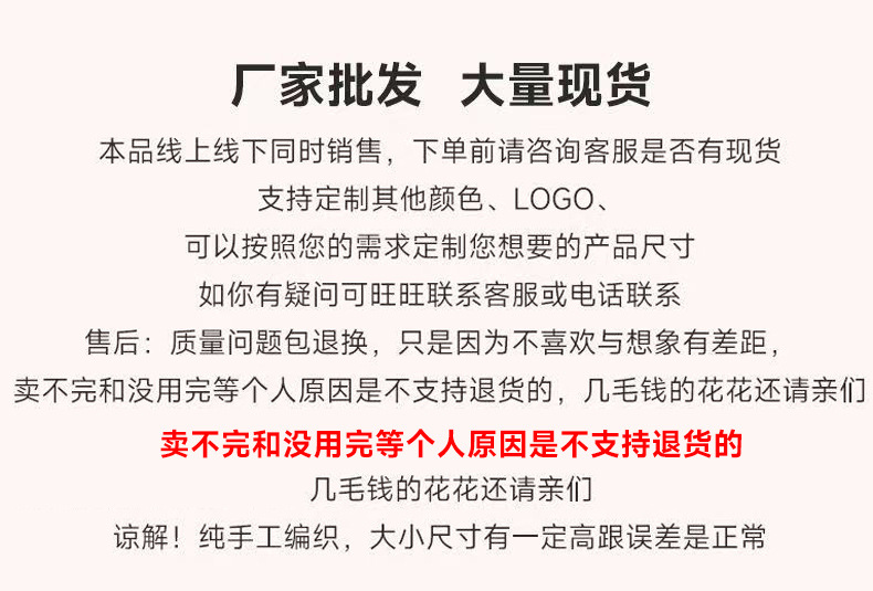 售后:质量问题包退换,只是因为不喜欢与想象有差距,卖不完和没用完等个人原因是不支持退货的,几毛钱的花花还请亲们谅解!纯手工编织,大小尺寸有一定高跟误差是正常