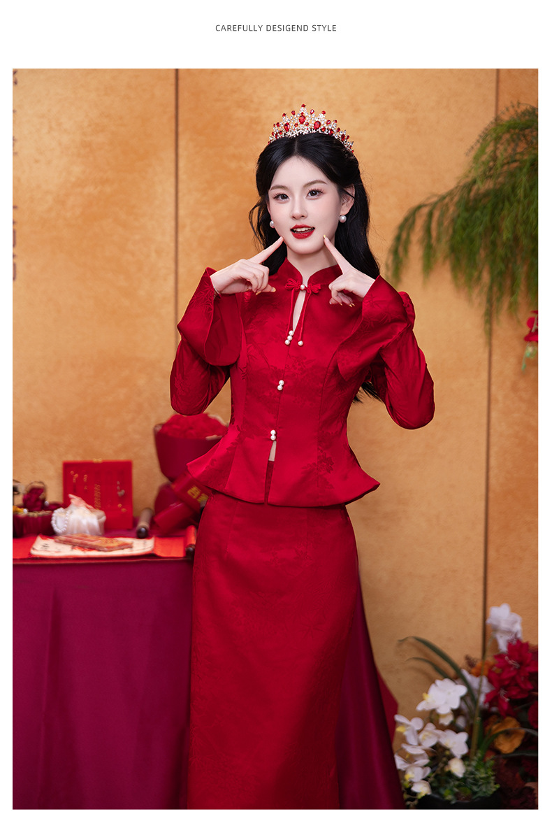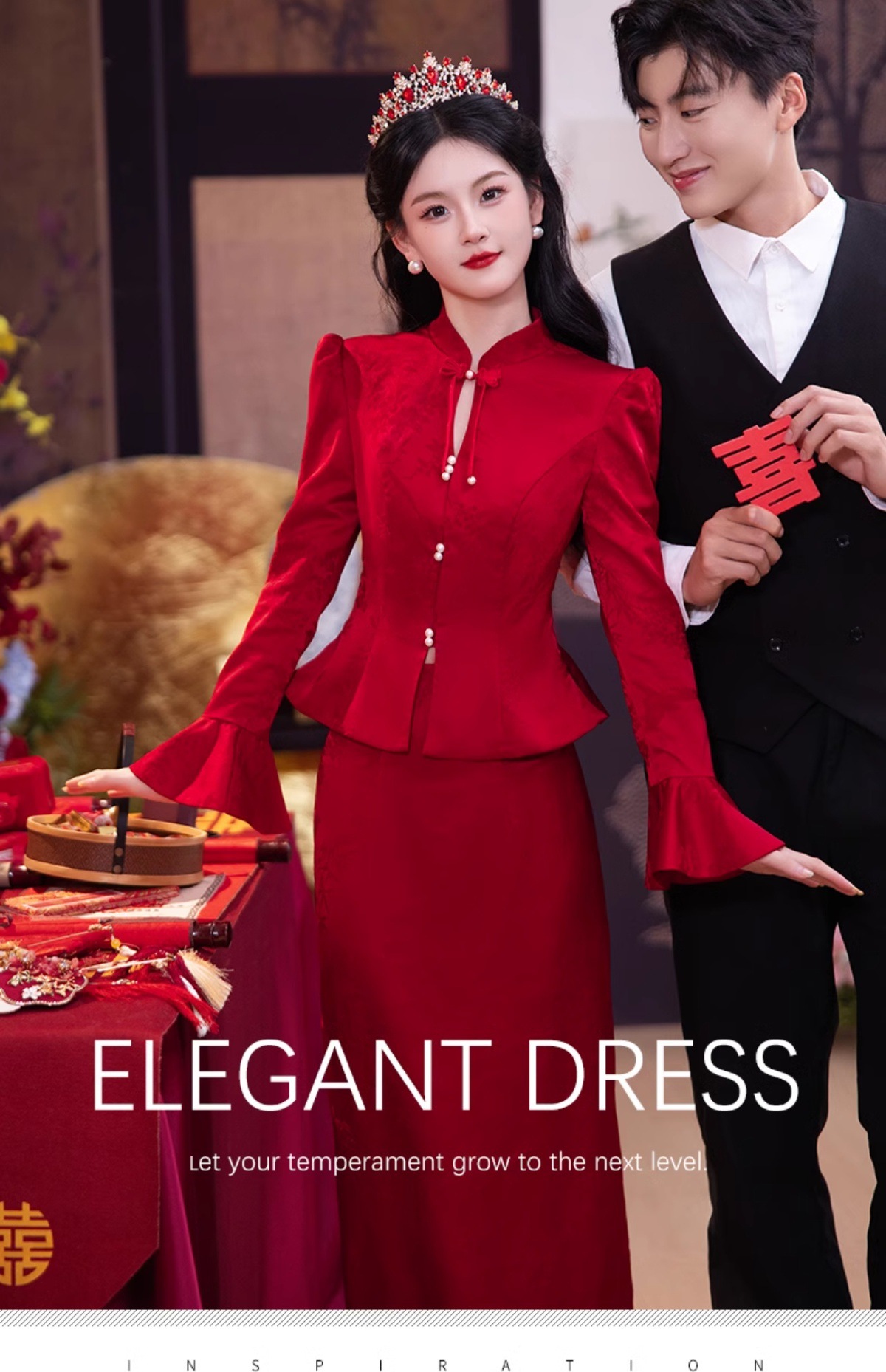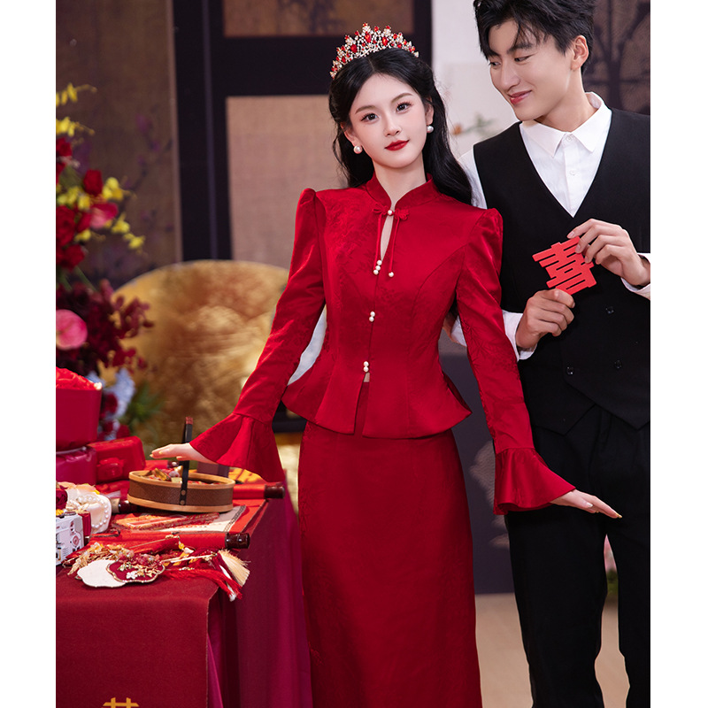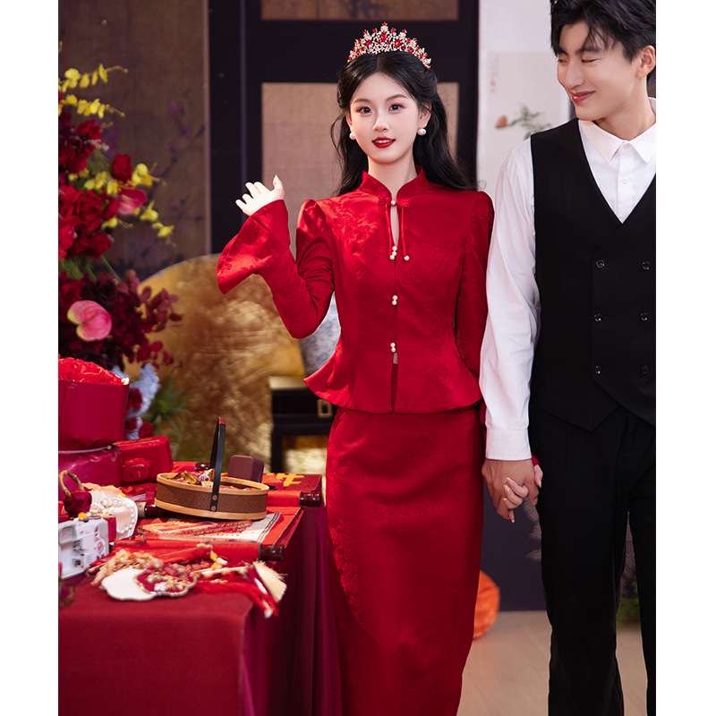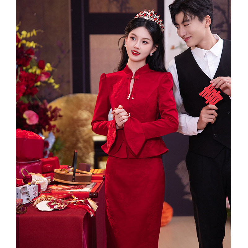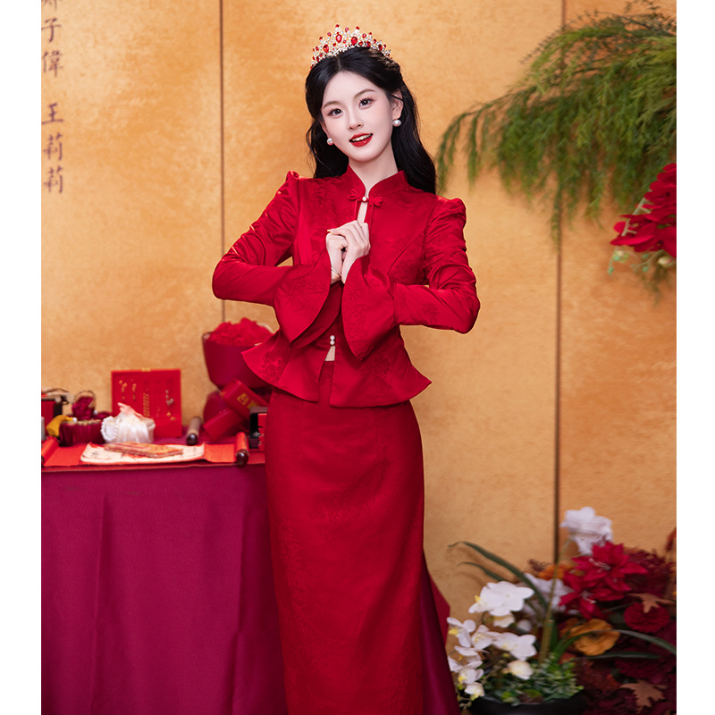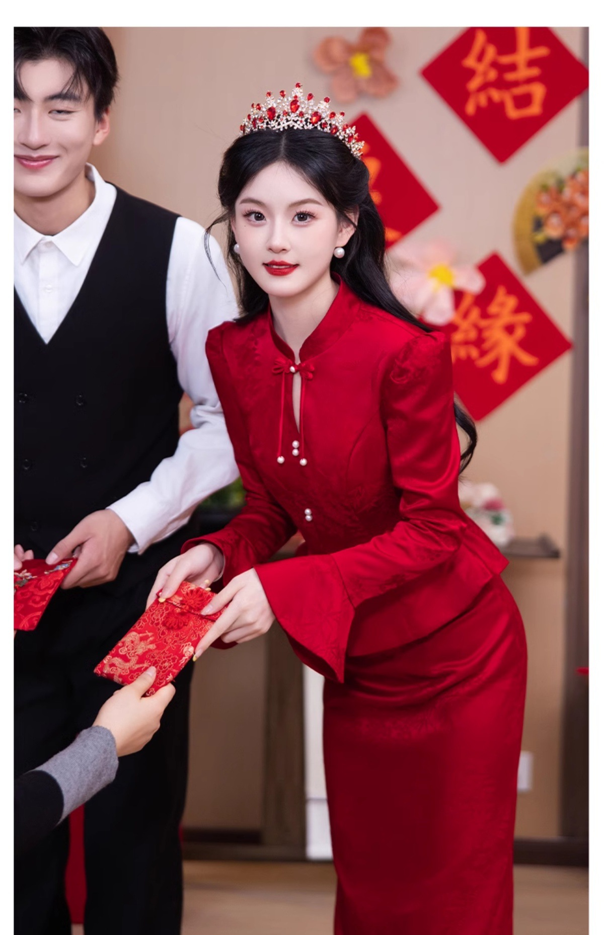 Платье-ципао для невесты невысокого роста, красное свадебное платье для помолвки, новый свадебный костюм в китайском стиле, весеннее платье с длинным рукавом
