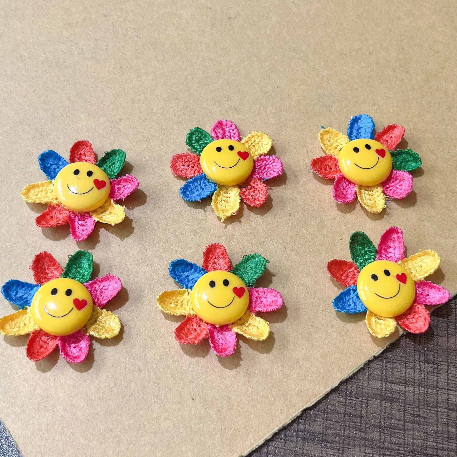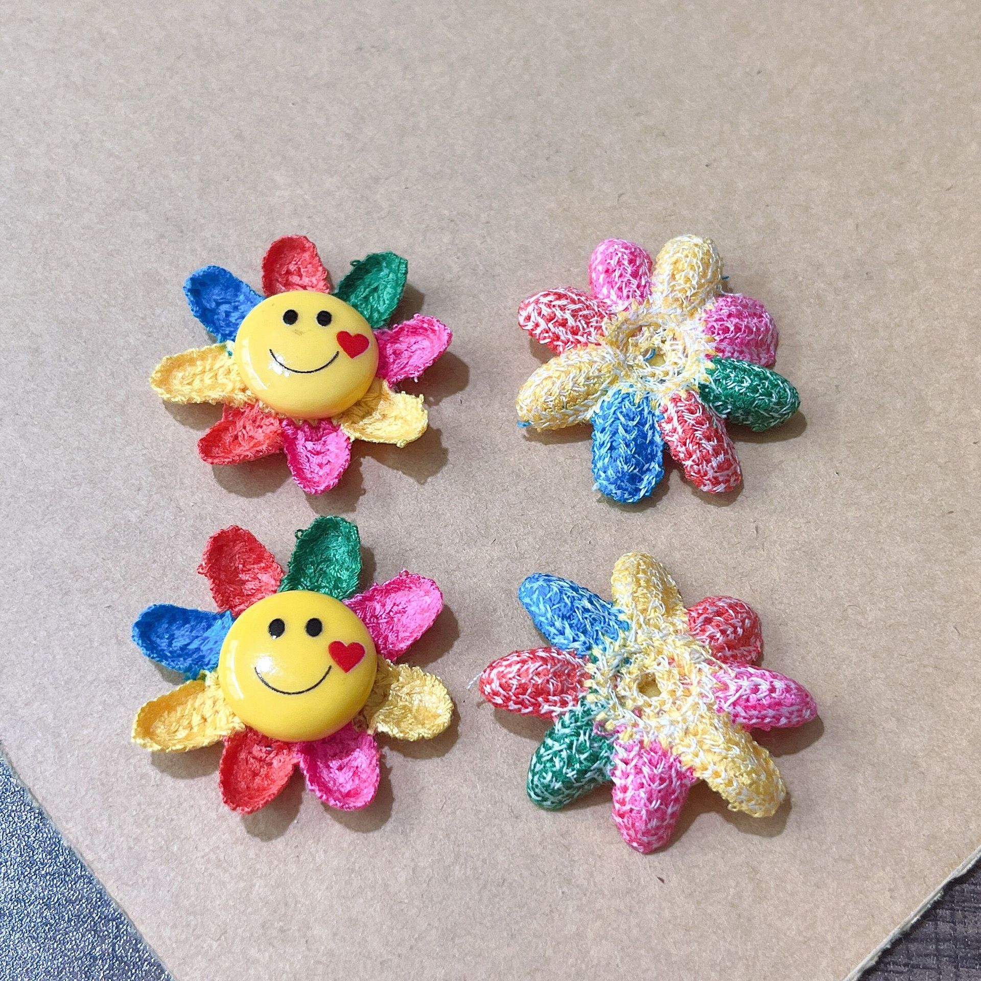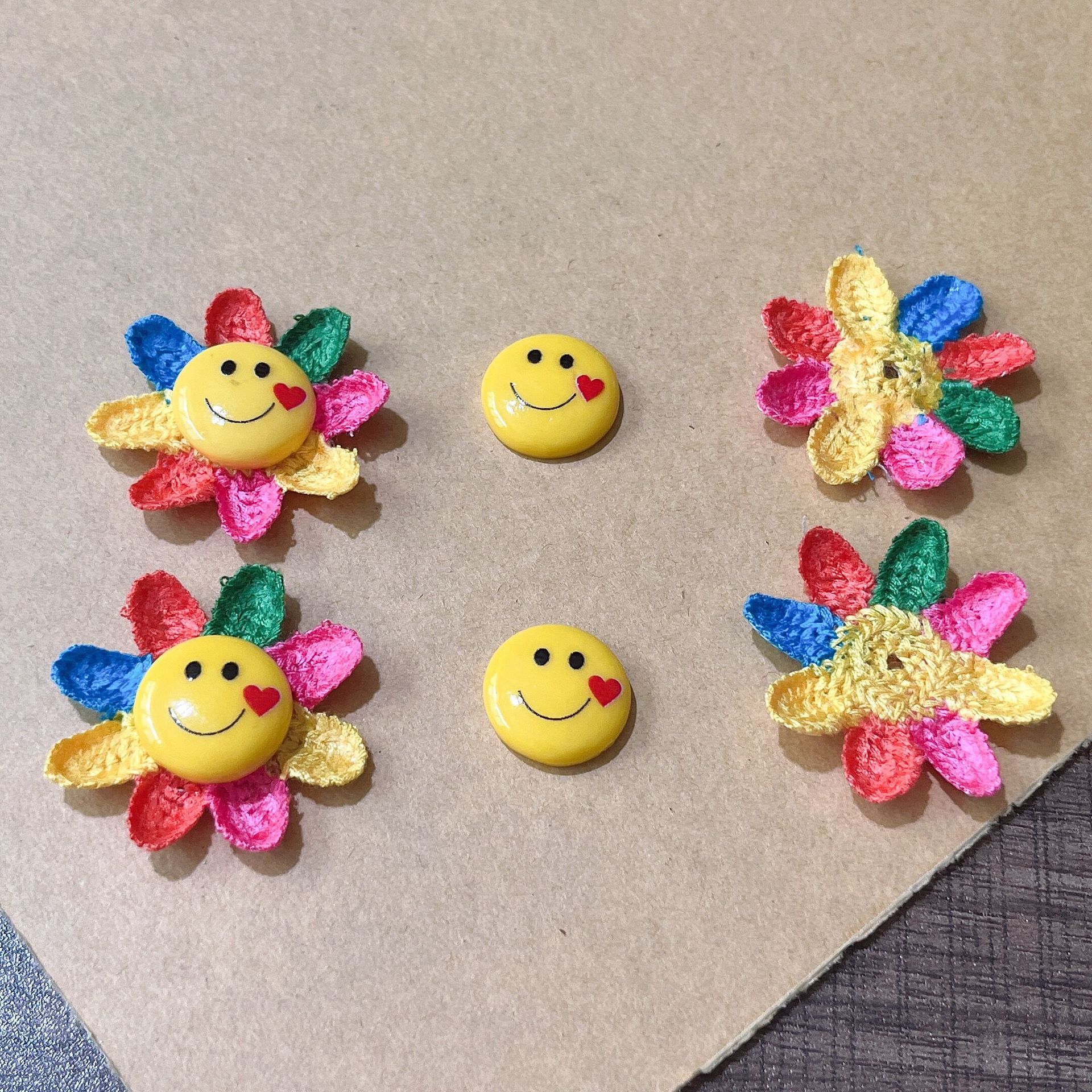 1#Красочные аксессуары для лица со смайликом своими руками; 2#Желтые аксессуары Love Smiley-DIY; 3#Вязаные разноцветные цветы-аксессуары своими руками