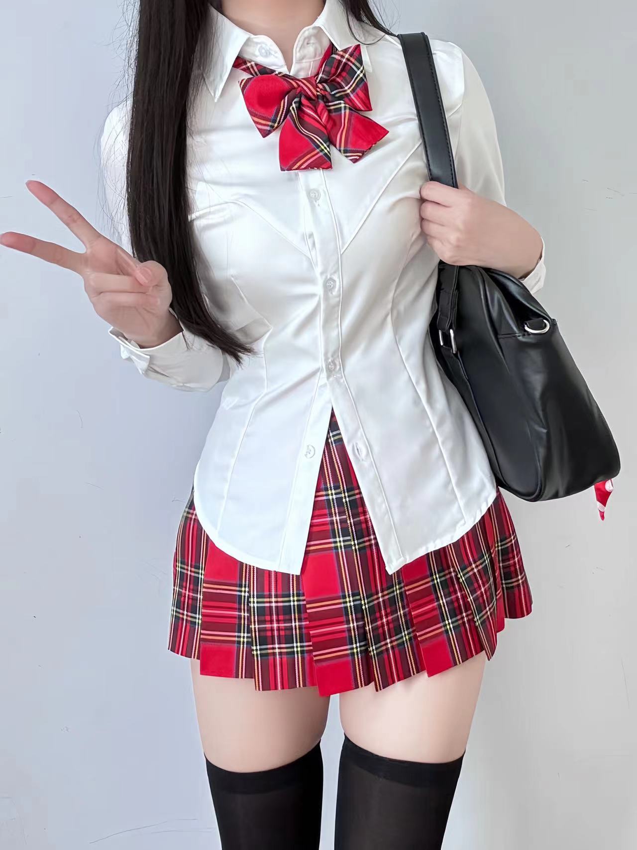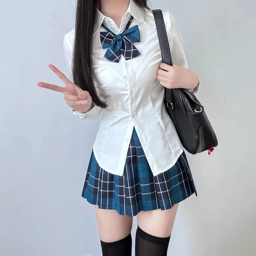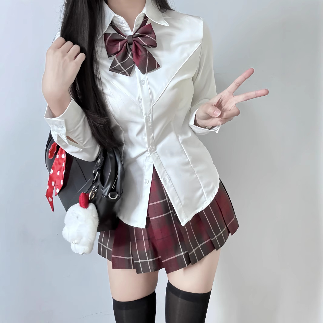 Одинарная V-образная рубашка с длинными рукавами.; Рубашка V-образной формы с длинными рукавами + клетчатая юбка глоду (входит галстук-бабочка); V-образная рубашка с длинными рукавами + юбка с рюшами (в комплекте с галстуком-бабочкой); V-образная рубашка с длинными рукавами + клетчатая юбка из морских водорослей (в комплекте с галстуком-бабочкой); Рубашка V-образной формы с длинными рукавами + клетчатая юбка Akitachi Fish (входит галстук-бабочка); Рубашка V-образной формы с длинными рукавами + юбка в клетку Dalan (в комплекте с галстуком-бабочкой); Рубашка V-образной формы с длинными рукавами + маленькая клетчатая юбка из перца (в комплекте с галстуком-бабочкой); V-образная рубашка с длинными рукавами + классная клетчатая юбка (в комплекте с галстуком-бабочкой)