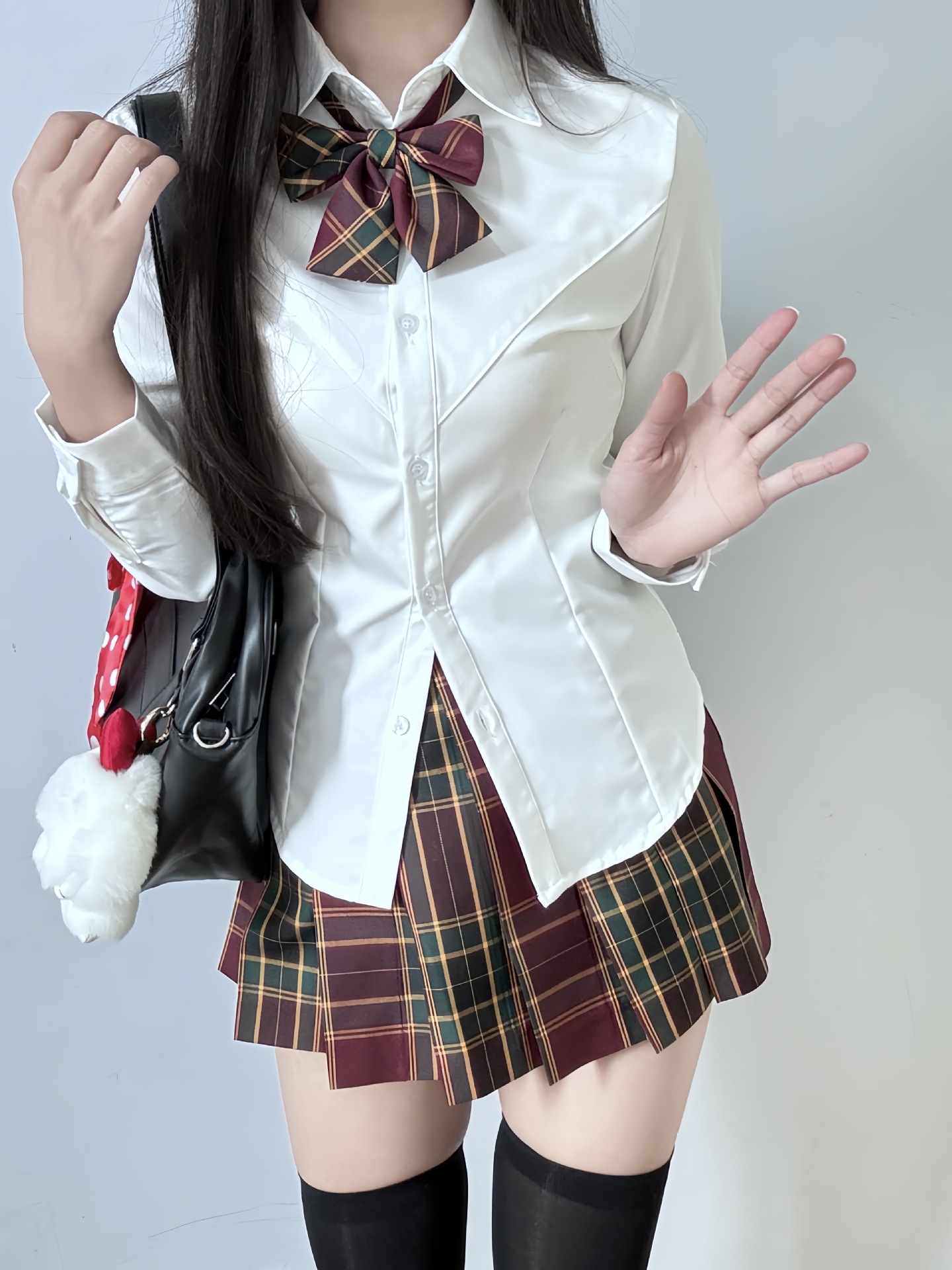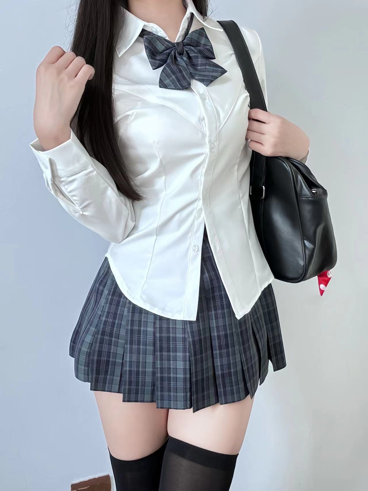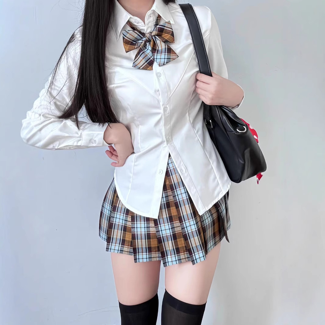 Одинарная V-образная рубашка с длинными рукавами.; Рубашка V-образной формы с длинными рукавами + клетчатая юбка глоду (входит галстук-бабочка); V-образная рубашка с длинными рукавами + юбка с рюшами (в комплекте с галстуком-бабочкой); V-образная рубашка с длинными рукавами + клетчатая юбка из морских водорослей (в комплекте с галстуком-бабочкой); Рубашка V-образной формы с длинными рукавами + клетчатая юбка Akitachi Fish (входит галстук-бабочка); Рубашка V-образной формы с длинными рукавами + юбка в клетку Dalan (в комплекте с галстуком-бабочкой); Рубашка V-образной формы с длинными рукавами + маленькая клетчатая юбка из перца (в комплекте с галстуком-бабочкой); V-образная рубашка с длинными рукавами + классная клетчатая юбка (в комплекте с галстуком-бабочкой)
