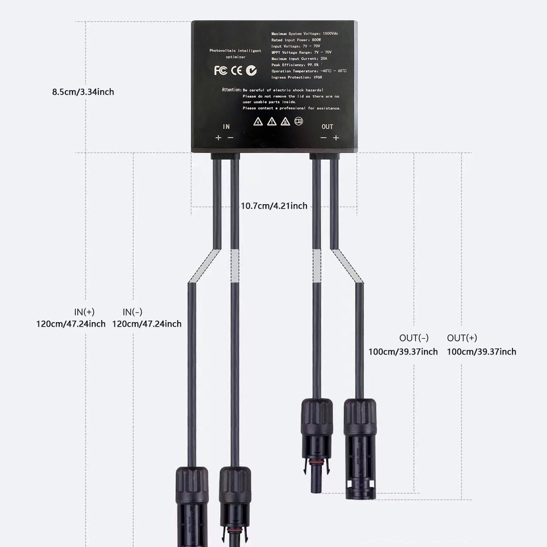 【简易安装】将太阳能板优化模块的输入端与光伏组件的输出端直接连接即可,降压升流。安装方便、简单。