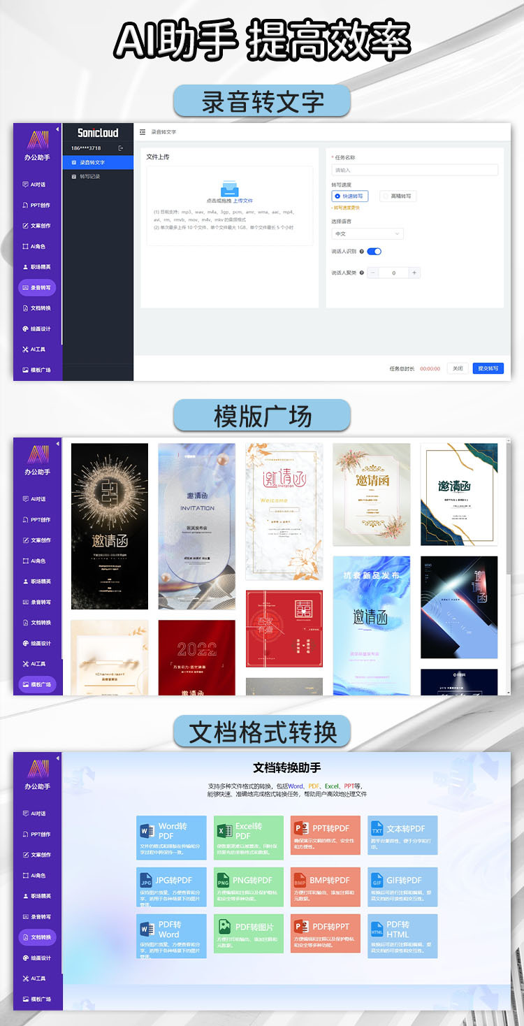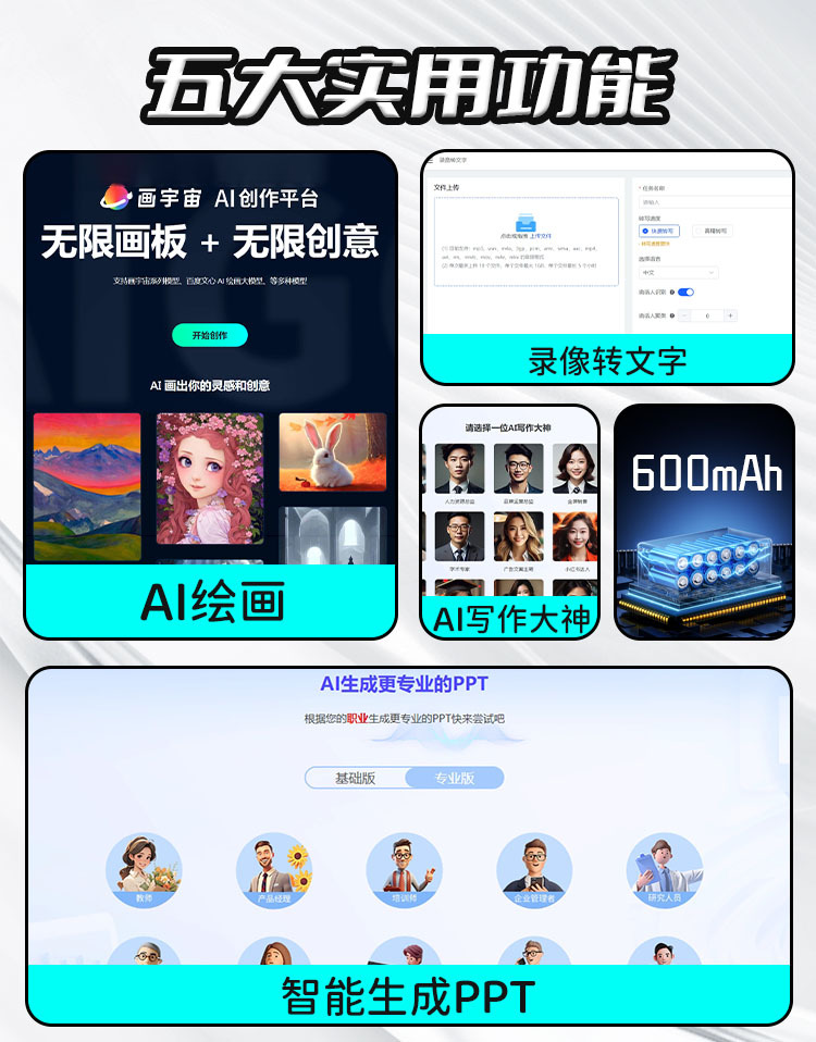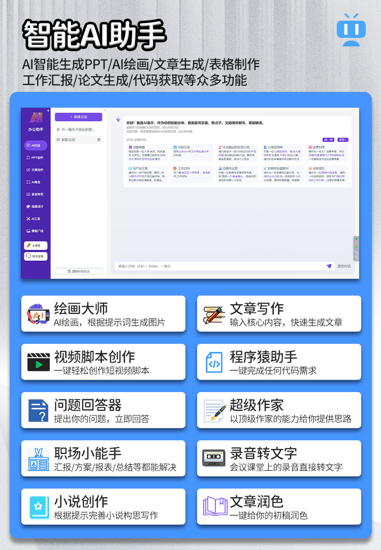 Умный разговор, Генерация слайдов (PPT), Картирование мыслей, Мастер рисования, Писатель статей, Ассистент на рабочем месте, Скриптование видео, Мастер кода, Супер писатель, Снимок экрана
