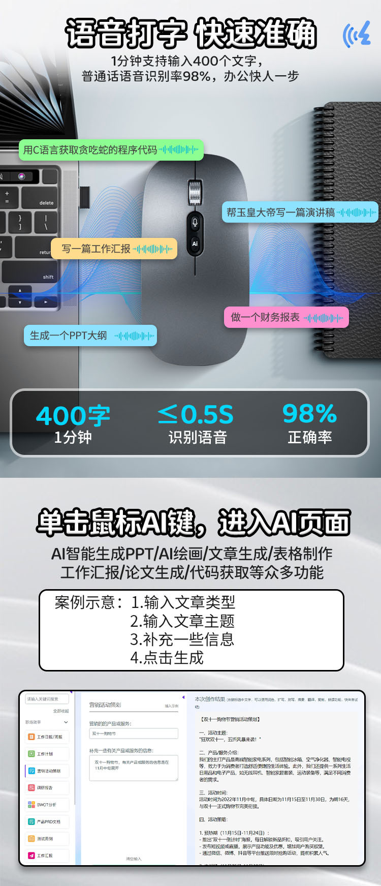 F1智能ai无线鼠标语音打字截屏翻译文案创作绘画支持定制logoAI