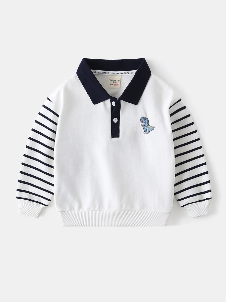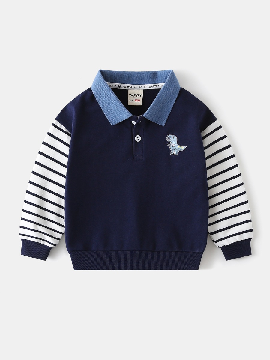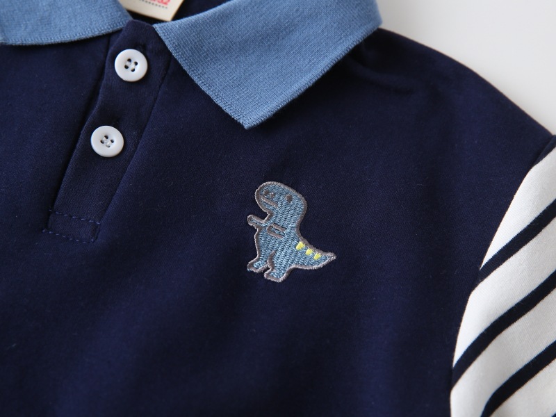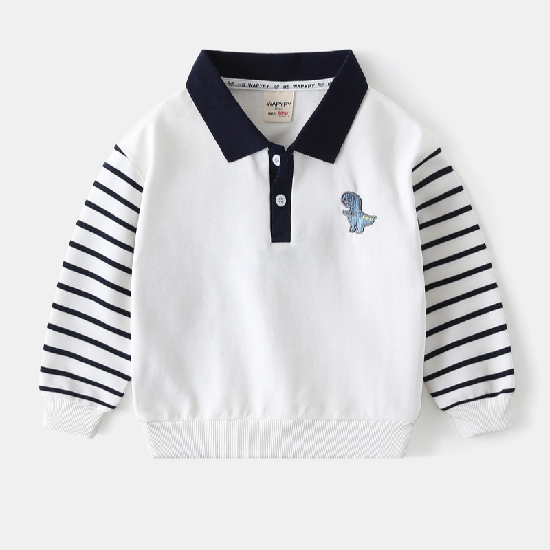 Оптовая продажа детской одежды весна-осень 2026: Новая модная толстовка для мальчиков с вышивкой динозавра, лоскутными рукавами и отложным воротником