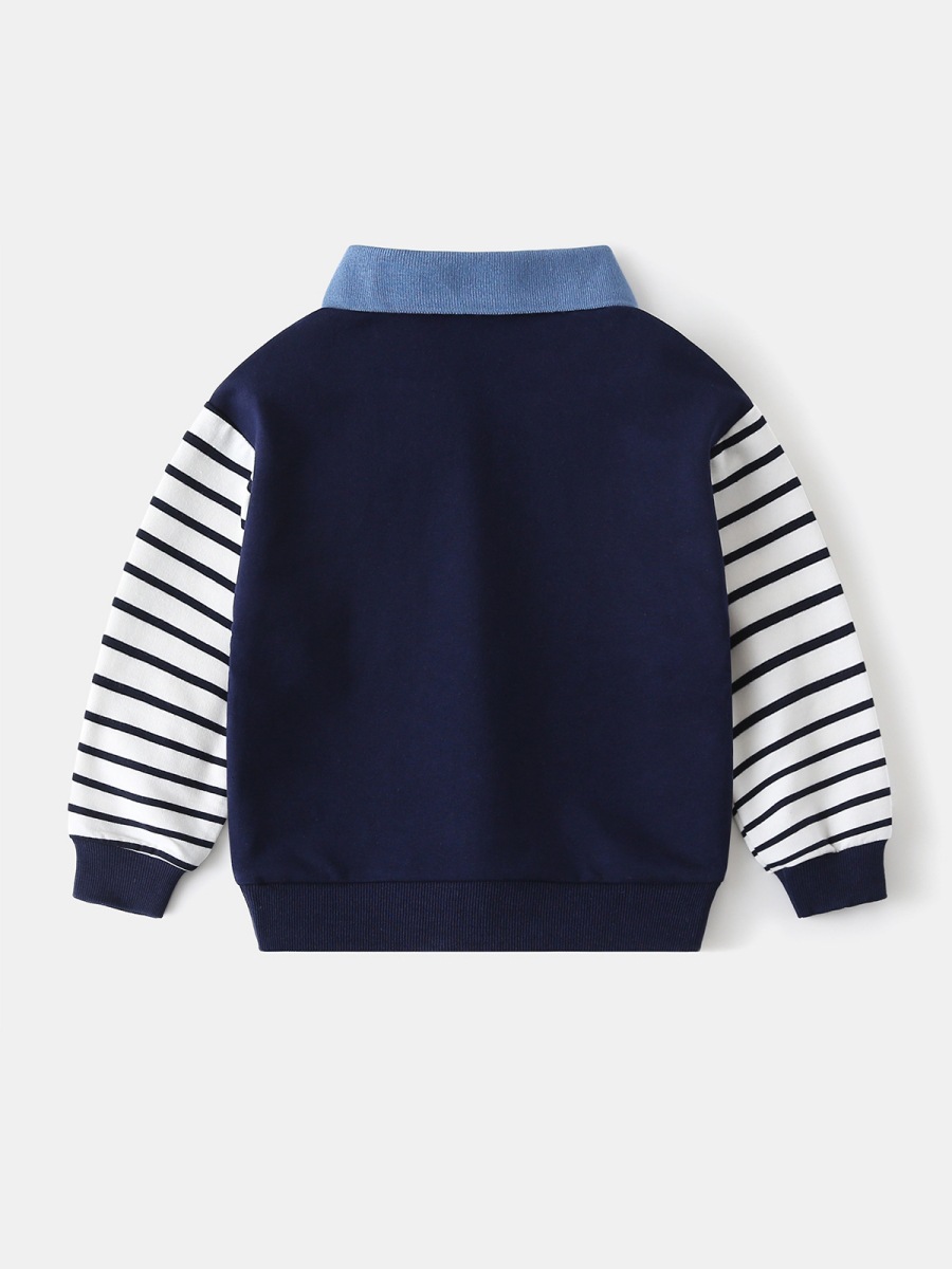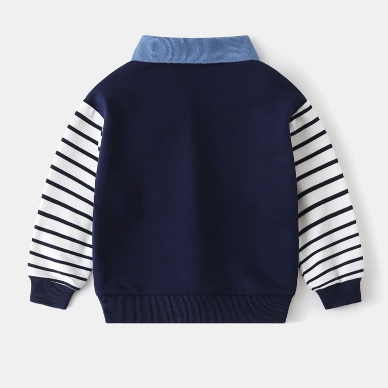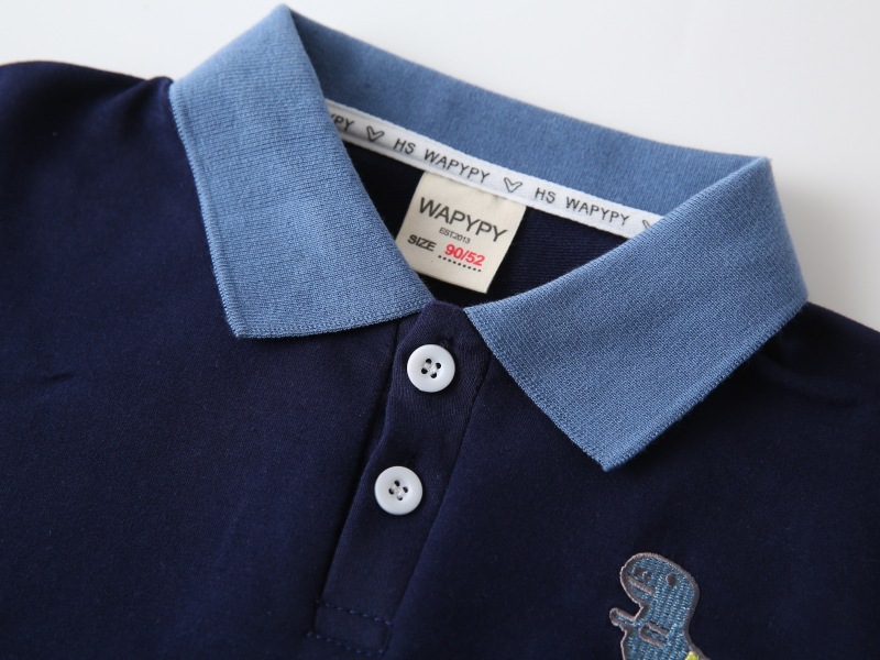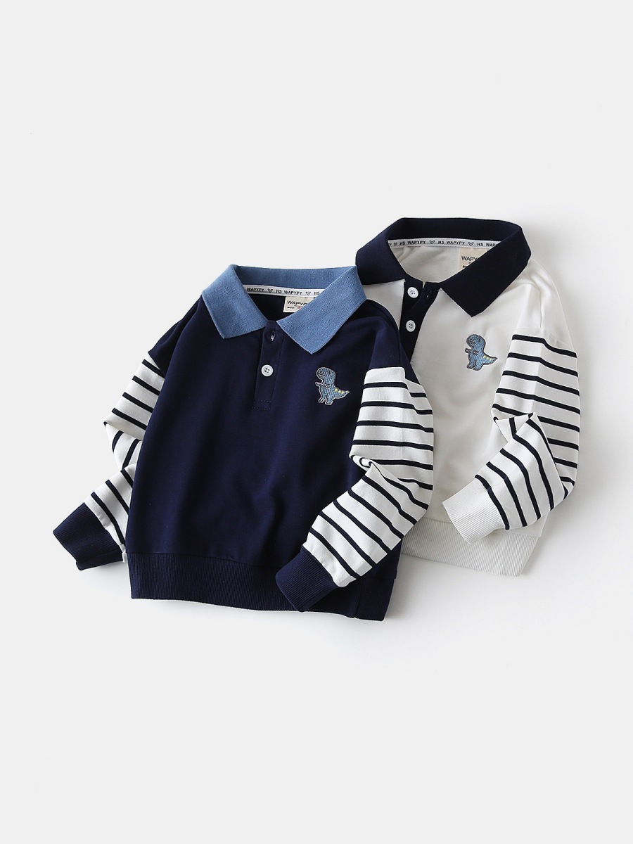 Оптовая продажа детской одежды весна-осень 2026: Новая модная толстовка для мальчиков с вышивкой динозавра, лоскутными рукавами и отложным воротником