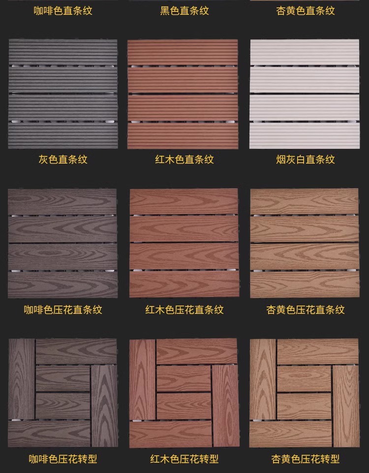 Прямые полосы цвета массива дерева; Прямые полосы цвета красного дерева; Шоколадные прямые полоски; Черно-серые прямые полосы.; Коричневые прямые полосы; Цвет тисненого дерева; тисненый цвет красного дерева; тисненый черный серый; тисненый коричневый; тисненый шоколадный цвет; Коэкструдированный тик 2-го поколения.; Совместноэкструдированный серебристо-серый цвет 2-го поколения.; Коэкструдированный цвет палисандра 2-го поколения.; Коэкструдированный цвет старинного дерева 2-го поколения.; ПВХ пластик цвет тик; ПВХ пластик красный коричневый; ПВХ пластик черный серый; ПВХ пластик высокого качества черного цвета; ПВХ пластик светло-серый