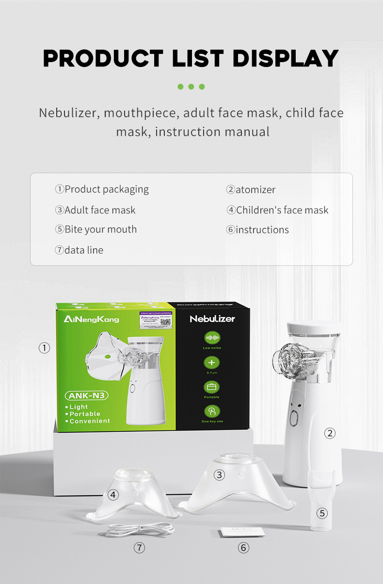1x небулайзер, 1x маска для взрослых, 1x маска для детей, 1x мундштук для небулайзера, 1x USB-кабель питания, 1x инструкция по эксплуатации