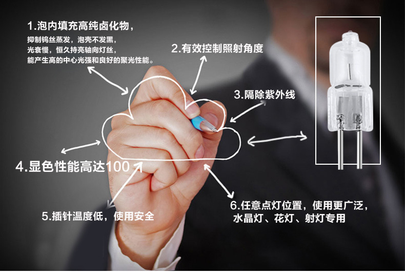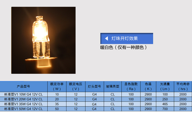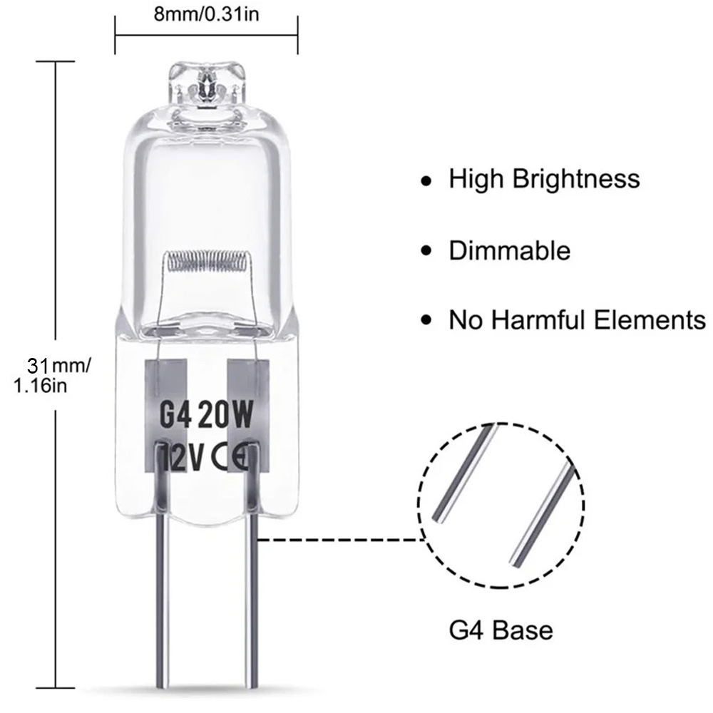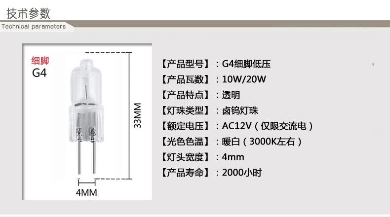 接口:G4 ,电压:12v,色温:2900K,泡壳直径: Φ8mm,泡壳长: 22mm,脚长:9mm,总长:31mm,脚粗:0.7mm,针脚中心距离:4mm