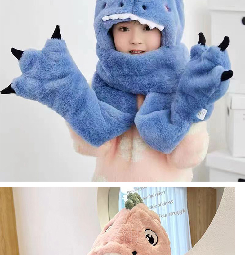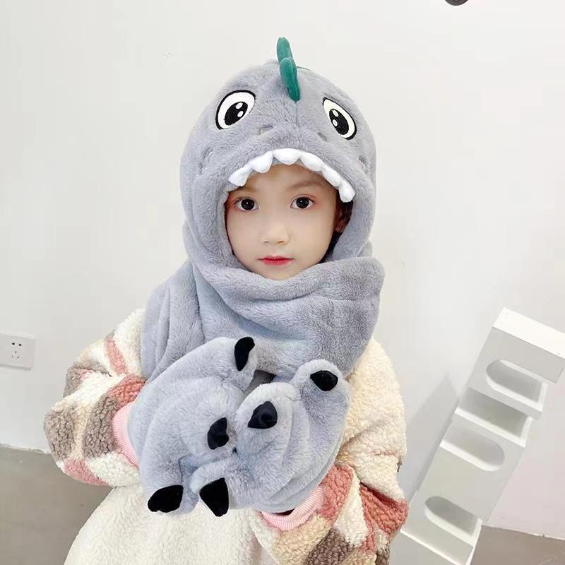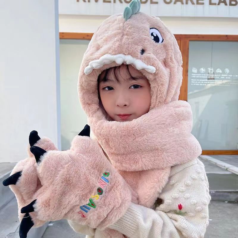 Детский комплект из шапки, шарфа и перчаток с динозаврами, ветрозащитный, для мальчиков и девочек, три в одном, ветрозащитный и теплый.