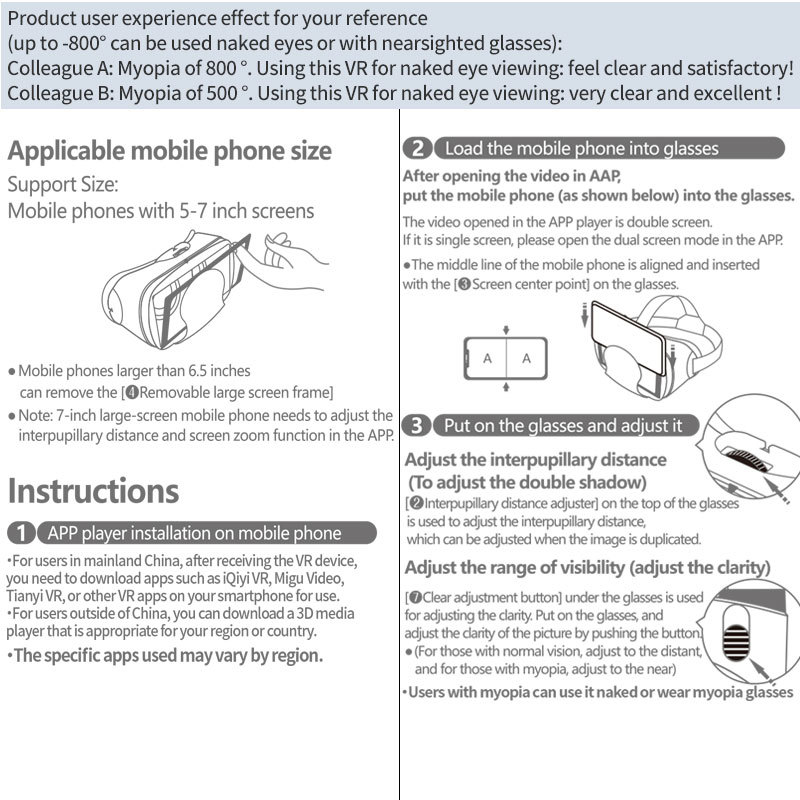 VR魔镜本身没有屏幕也无需用电池,必须配合手机一起使用;使用中所有的画面和声音来自于手机本身。因此体验效果跟手机本身的配置有非常重要的关系! The VR Magic Mirror itself does not have a screen and does not require a battery. It needs to be used in conjunction with a mobile phone. All the visuals and sounds during usage come from the mobile phone itself, so the experience is highly dependent on the configuration of the mobile phone.