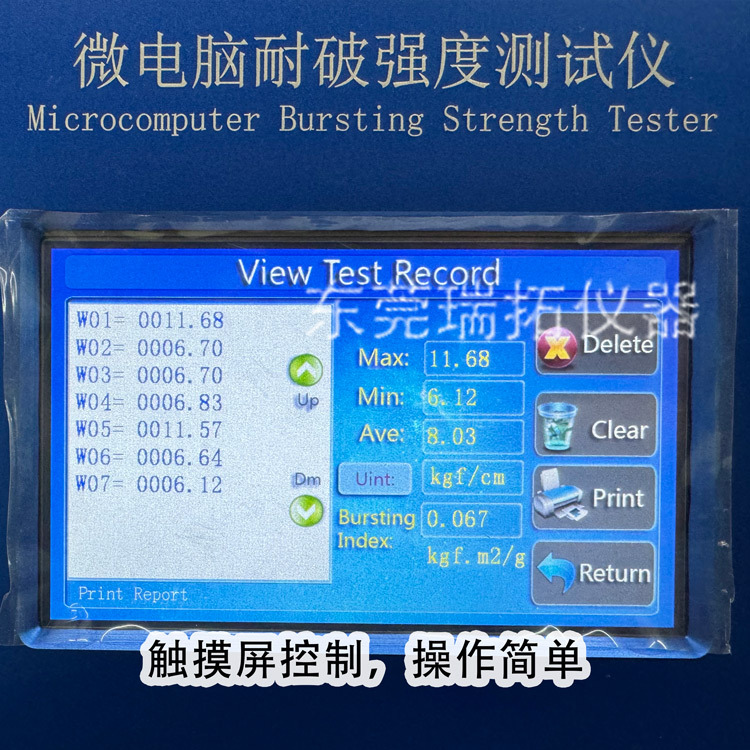 RT-406型自动断裂强度测试仪适用于测定原纸、瓦楞纸板、皮革、布料、合成革等材料的抗断裂强度。本试验机为全自动型断裂强度试验机,只需放入被试材料,试验机自动检测、自动试验、自动液压后坐和自动计算、存储试验数据并打印。它是产品质量控制和质量检验的重要测试设备。