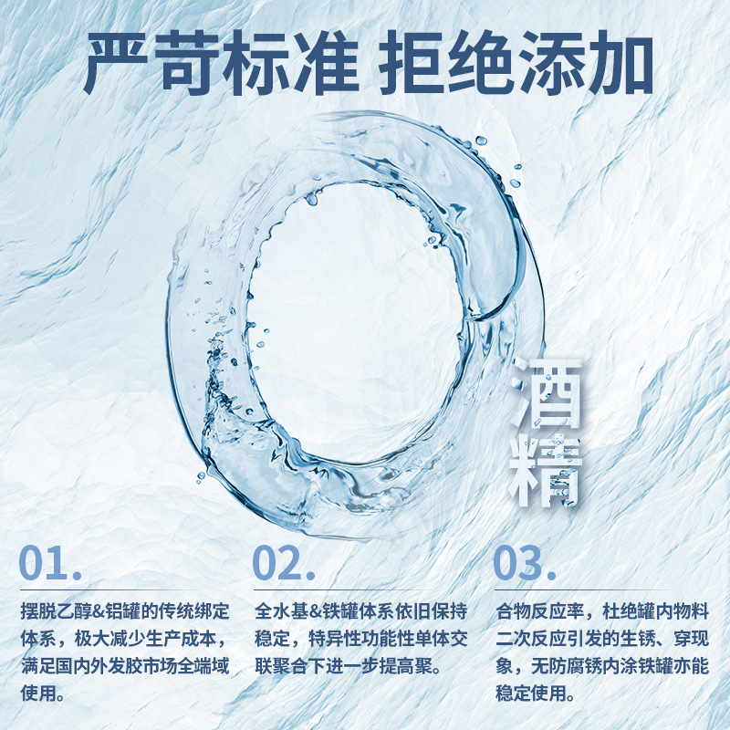 摆脱乙醇&铝罐的传统绑定体系,极大减少生产成本,满足国内外发胶市场全端域使用。