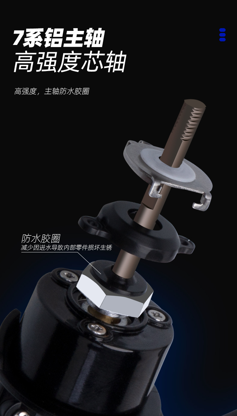 7系铝主轴,高强度芯轴,防水胶圈,减少因进水导致内部零部件损坏生锈