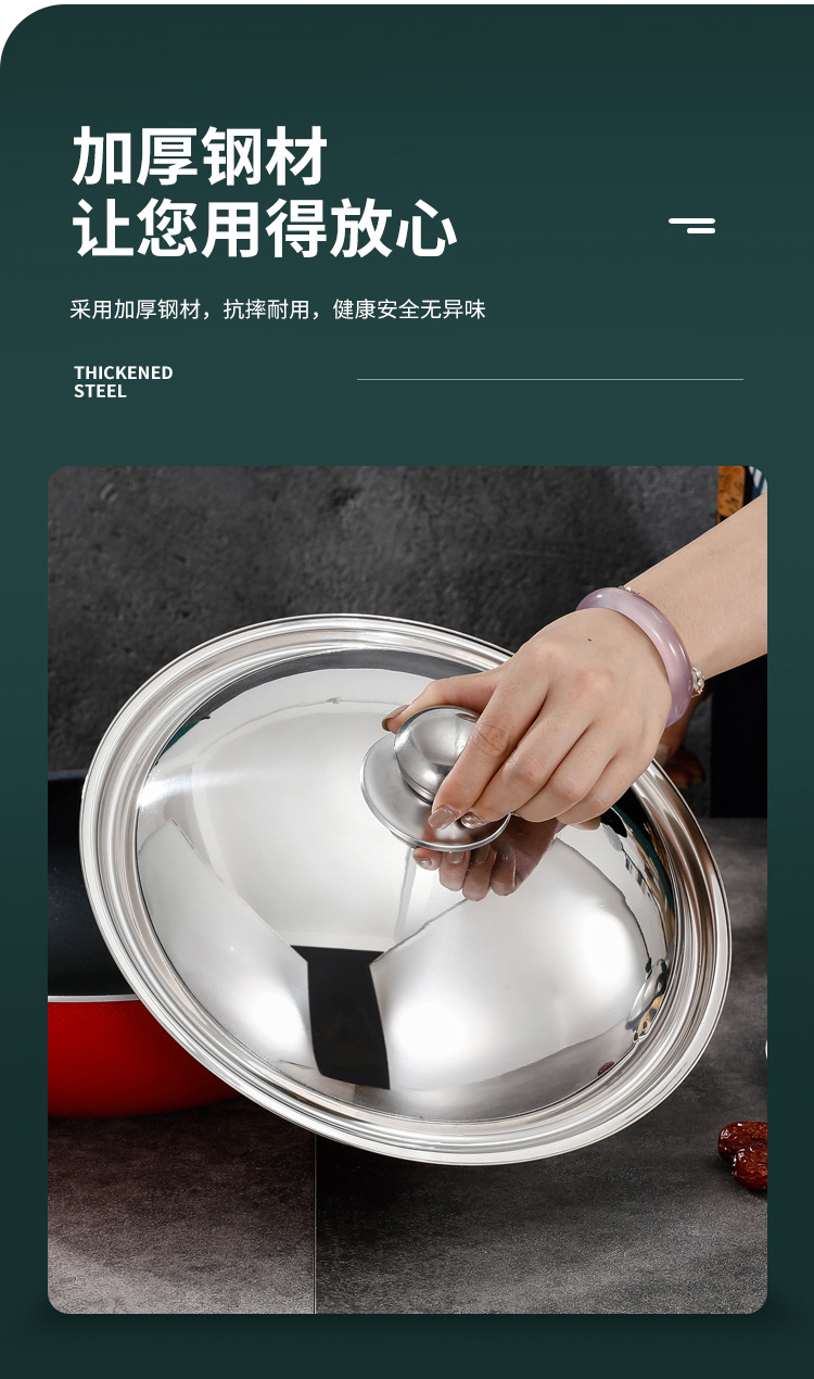 30CM锅盖适用28-29.5炒锅,32CM锅盖适用30-31.5炒锅,34CM锅盖适用32-33.5炒锅,36CM锅盖适用34-35.5炒锅,38CM锅盖适用36-37.5炒锅,40CM锅盖适用38-39.5炒锅。