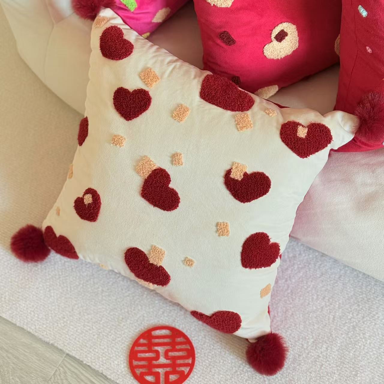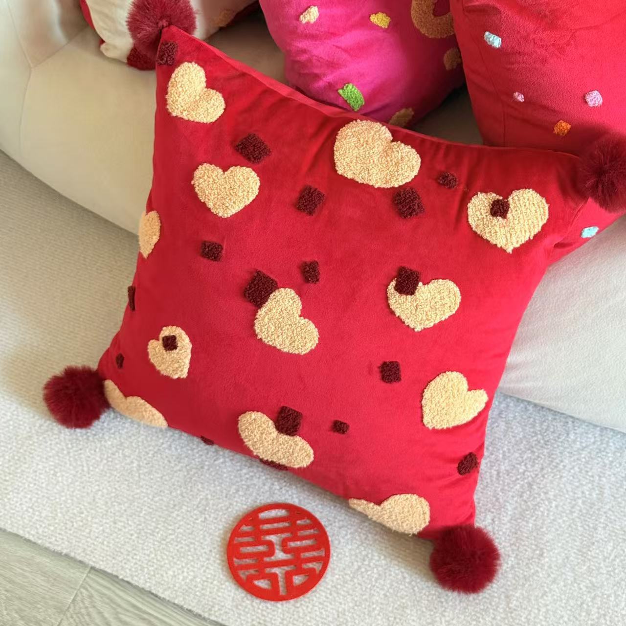 2024新款高级绒布抱枕毛球刺绣毛巾绣红色喜庆抱枕靠枕婚房沙发布置结婚婚礼压床娃娃新人送礼喜庆用品大全