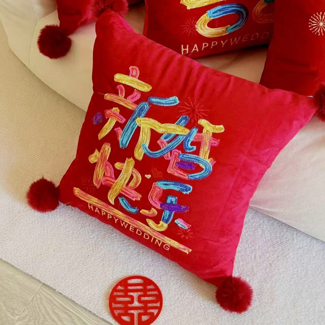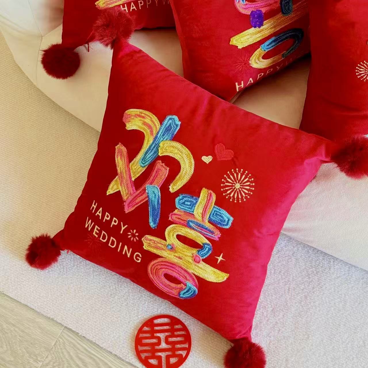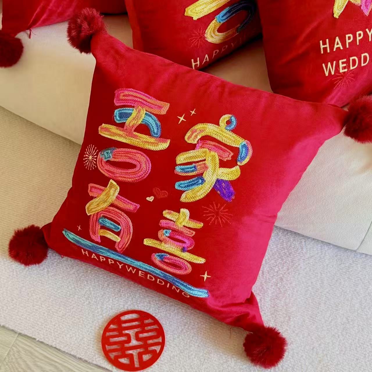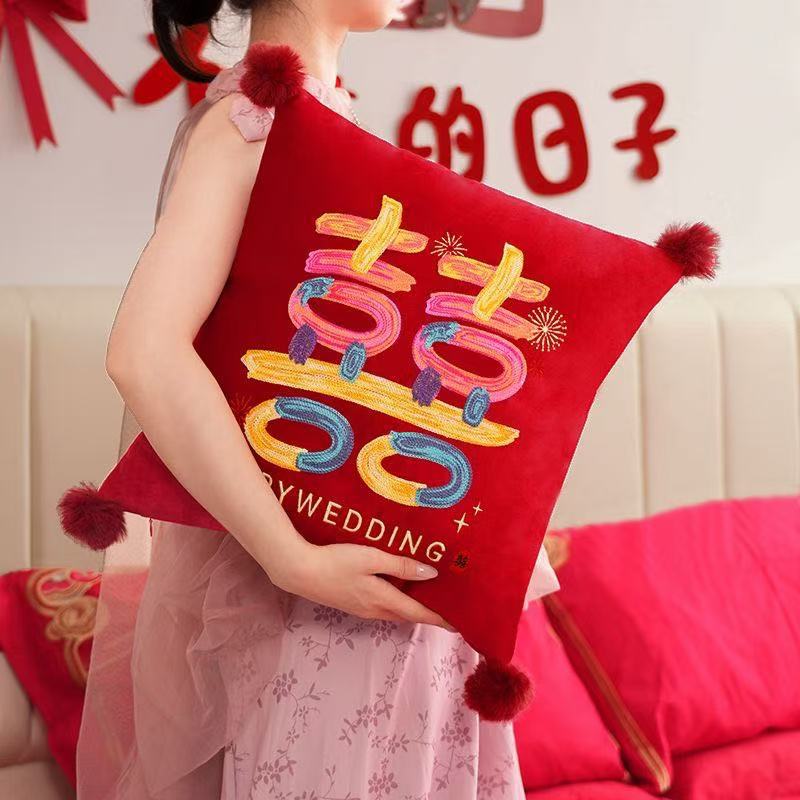 2024小红书爆款红色绒布刺绣抱枕毛球款多巴胺配色喜字含芯靠枕婚房客厅装扮布置压床娃娃新房婚礼送礼婚庆用品大全