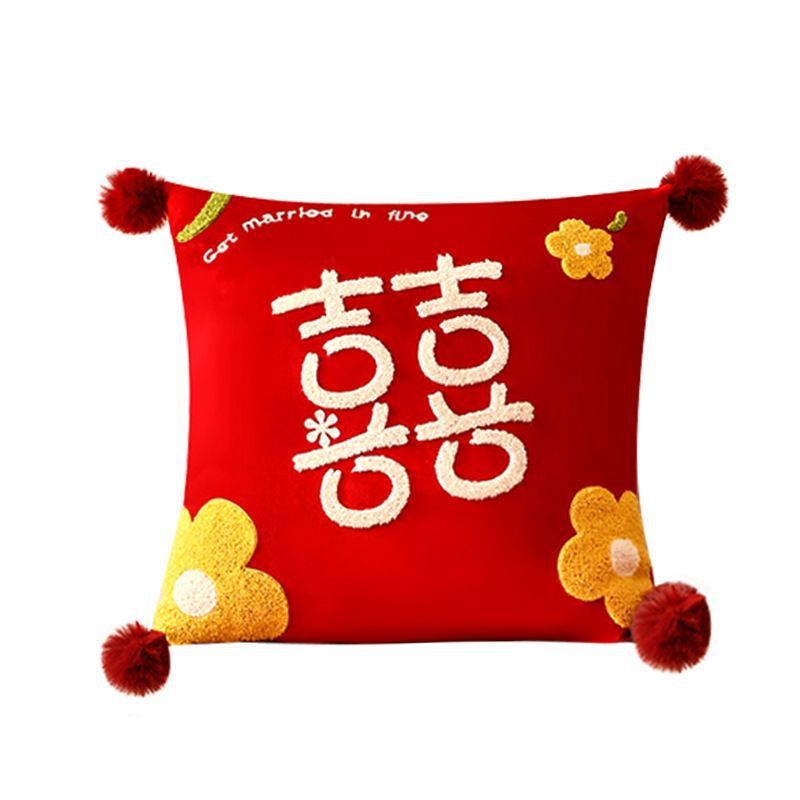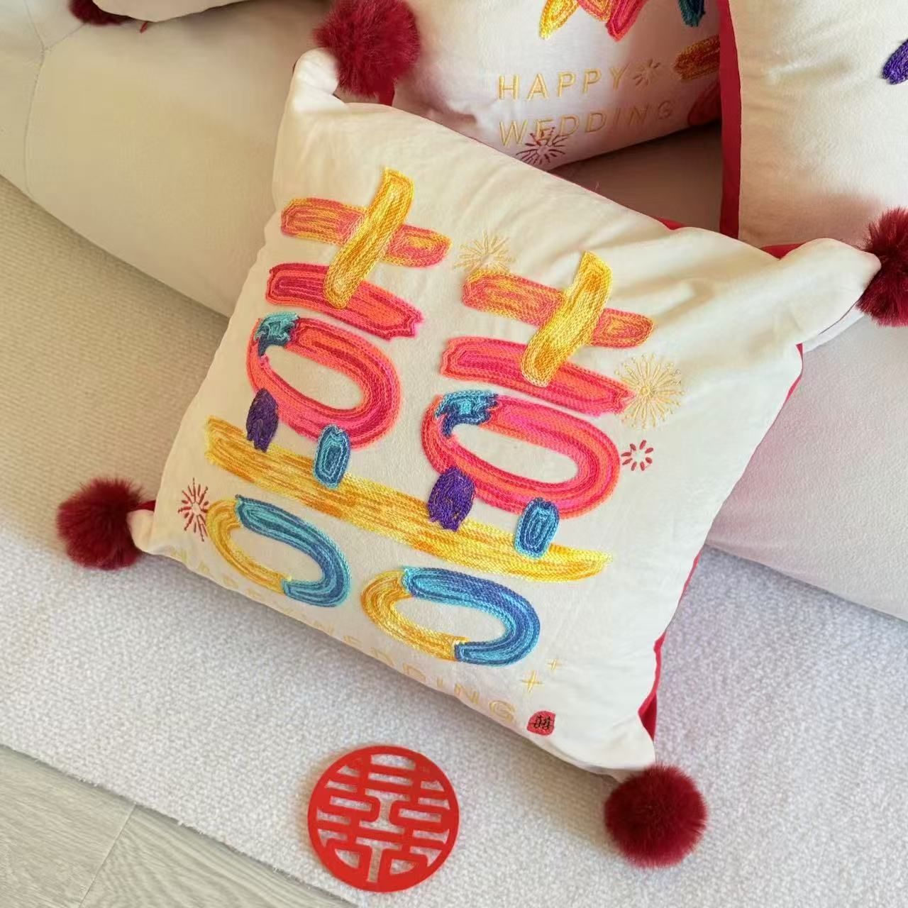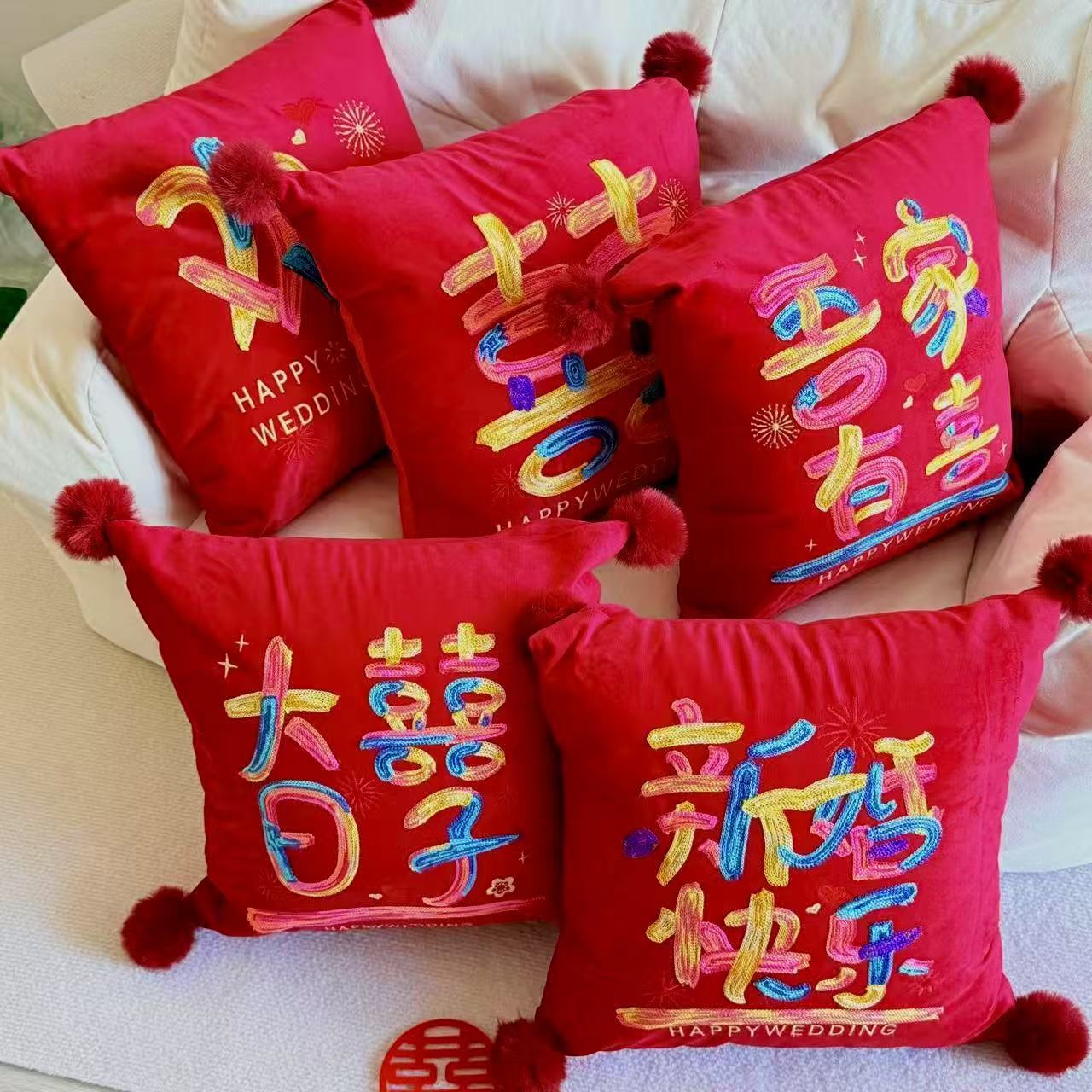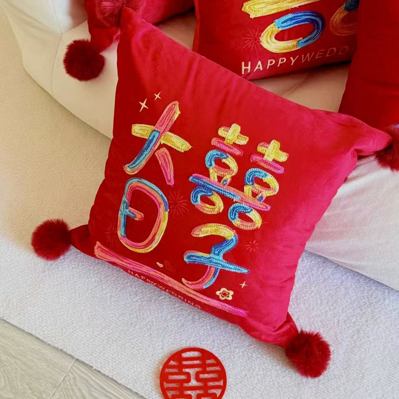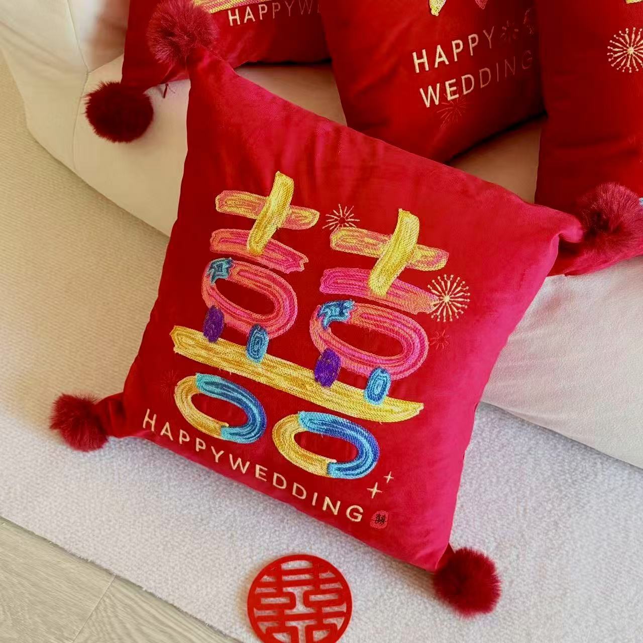 2024小红书爆款红色绒布刺绣抱枕毛球款多巴胺配色喜字含芯靠枕婚房客厅装扮布置压床娃娃新房婚礼送礼婚庆用品大全