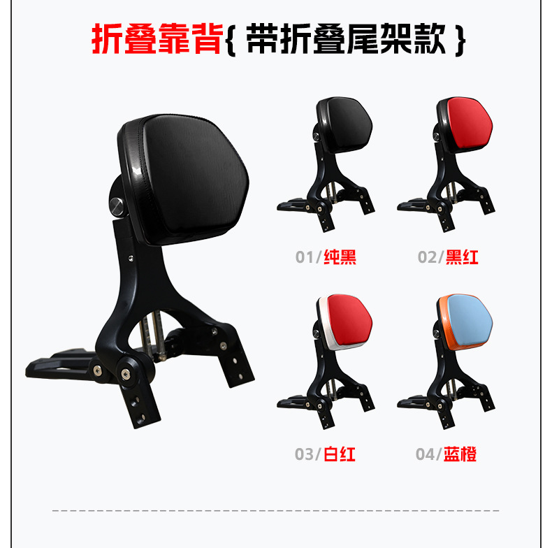 Складная спинка чистого черного цвета; Черно-красная складная спинка; Белая и красная складная спинка; Синяя и оранжевая складная спинка.; Складная спинка чистого черного цвета со складной хвостовой стойкой.; Черно-красная складная спинка со складной хвостовой стойкой.; Белая и красная складная спинка со складной хвостовой стойкой.; Синяя и оранжевая складная спинка со складной хвостовой полкой.; Складная спинка с гальваническим покрытием и складной хвостовой полкой.; Складная опора из черной сетки; Складная спинка из коричневой сетки; Складная спинка из черной сетки со складной хвостовой стойкой.; Складная спинка из коричневой сетки со складной хвостовой полкой.