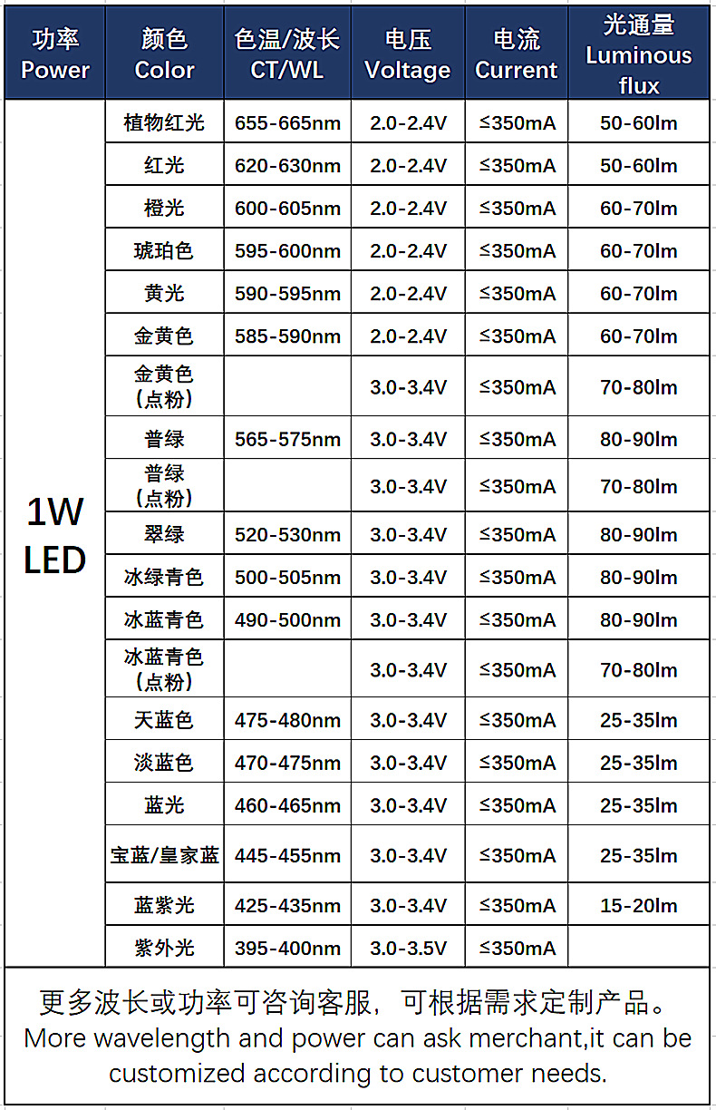 1 Вт белый свет 6000-6500К; 1Вт чистый белый 5000-5500К; 1Вт теплый белый 3000-3500К; 1Вт натуральный белый 4000-4500К; 1 Вт холодный белый 10000-15000К; 1Вт холодный белый 20000-25000К; 1Вт холодный белый 30000-35000К; 1 Вт УФ-свет 390-400 нм; 1 Вт синий и фиолетовый 410-415 нм; 1 Вт синий и фиолетовый 420-425 нм; 1 Вт синий фиолетовый 430-435 нм; 1 Вт сапфир синий 440-450 нм; 1 Вт Blu-ray 460-465 нм; 1 Вт голубой 470-475 нм; 1 Вт небесно-голубой 480-485 нм; 1 Вт ледяной синий голубой 490-500 нм; 1 Вт ледяной зеленый 500-510 нм; 1 Вт зеленый свет 520-530 нм; 1 Вт общий зеленый 540-545 нм; 1 Вт желто-зеленый 570-575 нм; 1 Вт точечный розовый однотонный зеленый; 1 Вт желтый свет 590-595 нм; 1 Вт золотисто-желтый 1800-2000К; 1 Вт Янтарный 595-605 нм; 1 Вт красный свет 620-630 нм; 1 Вт растение красное 655-665 нм; 1 Вт розовый фиолетовый; 1 Вт точечный розовый фиолетовый свет; 3 Вт белый свет 6000-6500К; 3 Вт чистый белый 5000-5500к; 3Вт теплый белый 3000-3500К; 3 Вт натуральный белый 4000-4500К; 3 Вт холодный белый 10000-15000К; 3Вт холодный белый 20000-25000К; 3Вт холодный белый 30000-35000К; 3 Вт УФ-свет 390-400 нм; 3 Вт синий и фиолетовый 410-415 нм; 3 Вт синий и фиолетовый 420-425 нм; 3 Вт синий фиолетовый 430-435 нм; 3 Вт сапфир синий 440-450 нм; 3 Вт Blu-ray 460-465 нм; 3 Вт голубой 470-475 нм; 3 Вт небесно-голубой 480-485 нм; 3 Вт ледяной синий голубой 490-500 нм; 3 Вт ледяной зеленый 500-510 нм; 3 Вт зеленый свет 520-530 нм; 3 Вт обычный зеленый 540-545 нм; 3 Вт желто-зеленый 570-757 нм; 3 Вт точка розовый однотонный зеленый; 3 Вт желтый свет 590-595 нм; 3 Вт Янтарный 595-605 нм; 3 Вт красный свет 620-630 нм; 3 Вт растение красное 655-665 нм; 3 Вт розовый фиолетовый; 3 Вт точечный розовый фиолетовый свет
