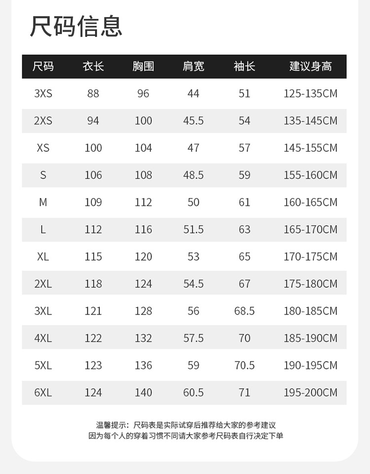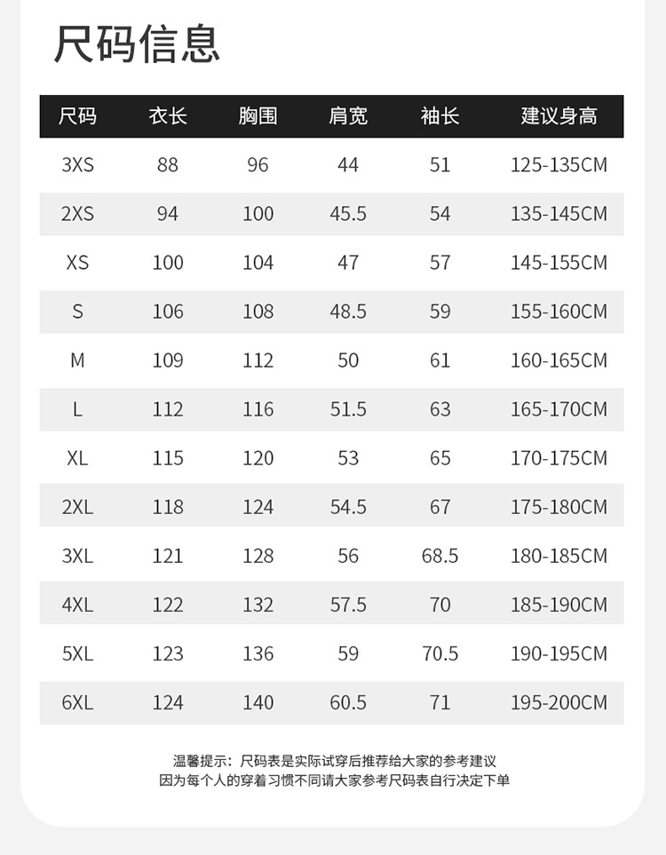3XS-130; 2XS-140; XS-150; S-160; M-165; L-170; XL-175; 2XL-180; 3XL-185; 4XL-190; 5XL-195; 6XL-200