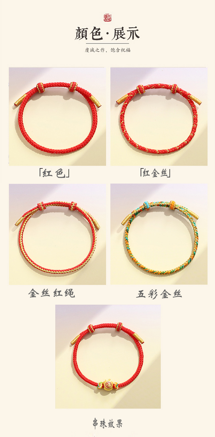 Красная веревка на год рождения; Узел Лотоса, плетение из восьми прядей - стиль с двойной завязкой; Восьмистрочная коса из бисера (красная с петлями); Восьмистрочная коса из бисера (черная петля); Узел «Красный Лотос» с восьмипрядной косой – Стиль «Спиральный Дракон»; Бордовый узел лотоса, восьмипрядная коса - стиль спирального дракона; Восьмистрочная коса (Qianli Jiangshan Red); Восьмистрочная коса (Qianli Jiangshan Blue); Узел чешуи красного дракона (плоский); Разноцветный узел в чешуе дракона (плоский); Красная веревка на год рождения (с кругом); Нить из красного золота на год рождения; проволока из красного золота; Разноцветная веревка на год рождения