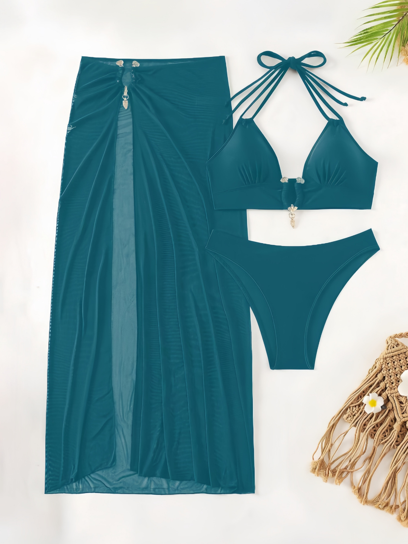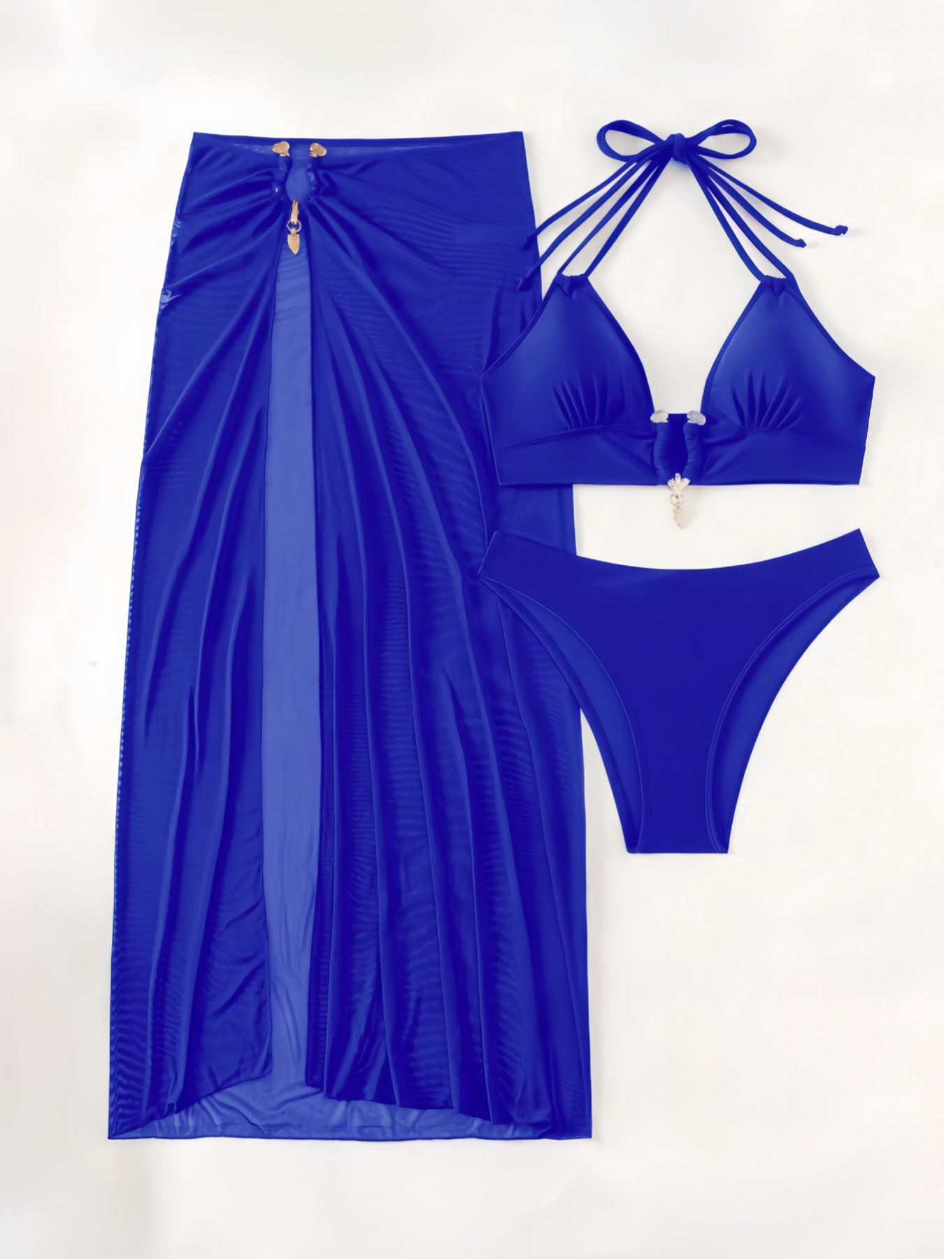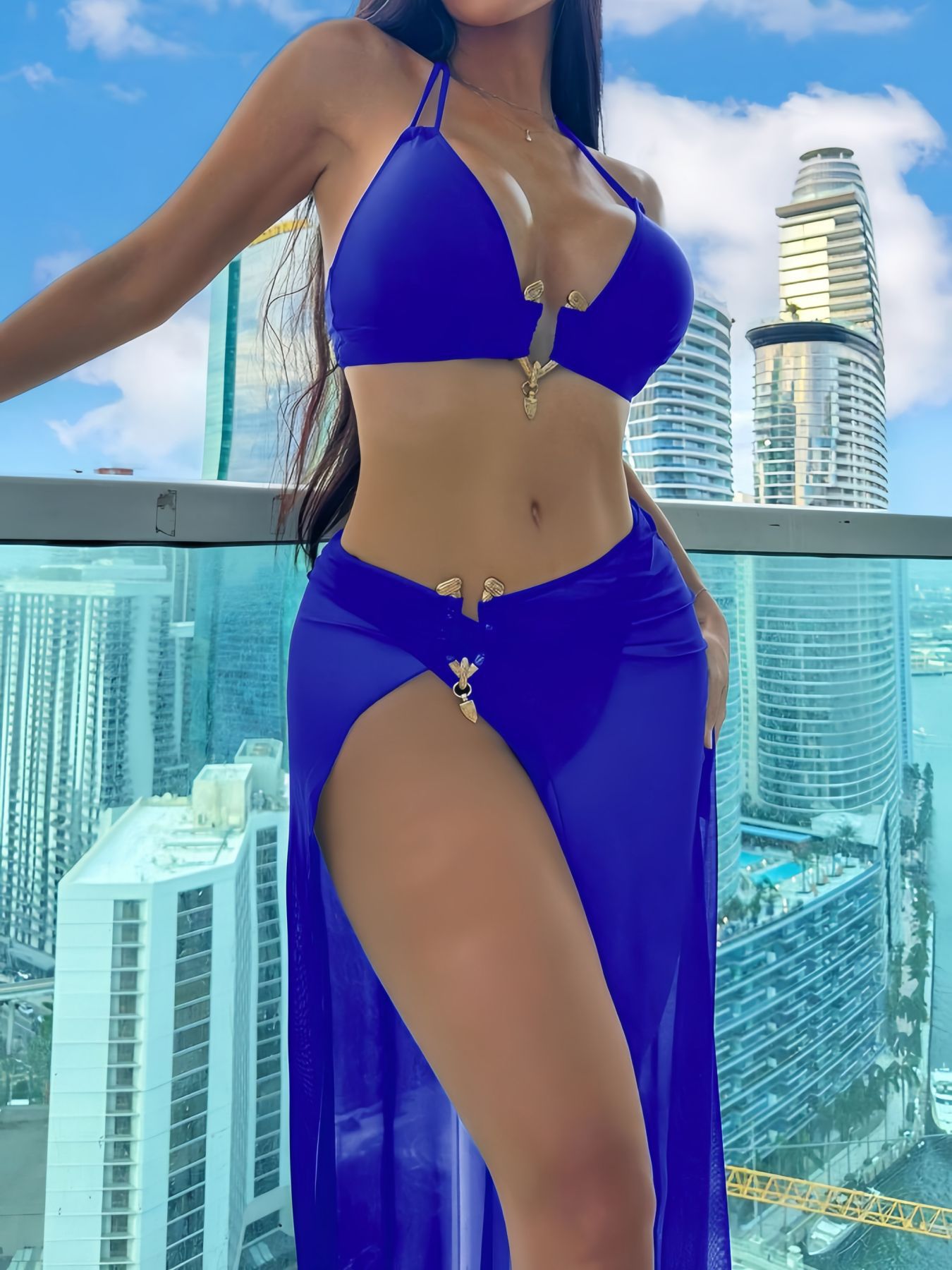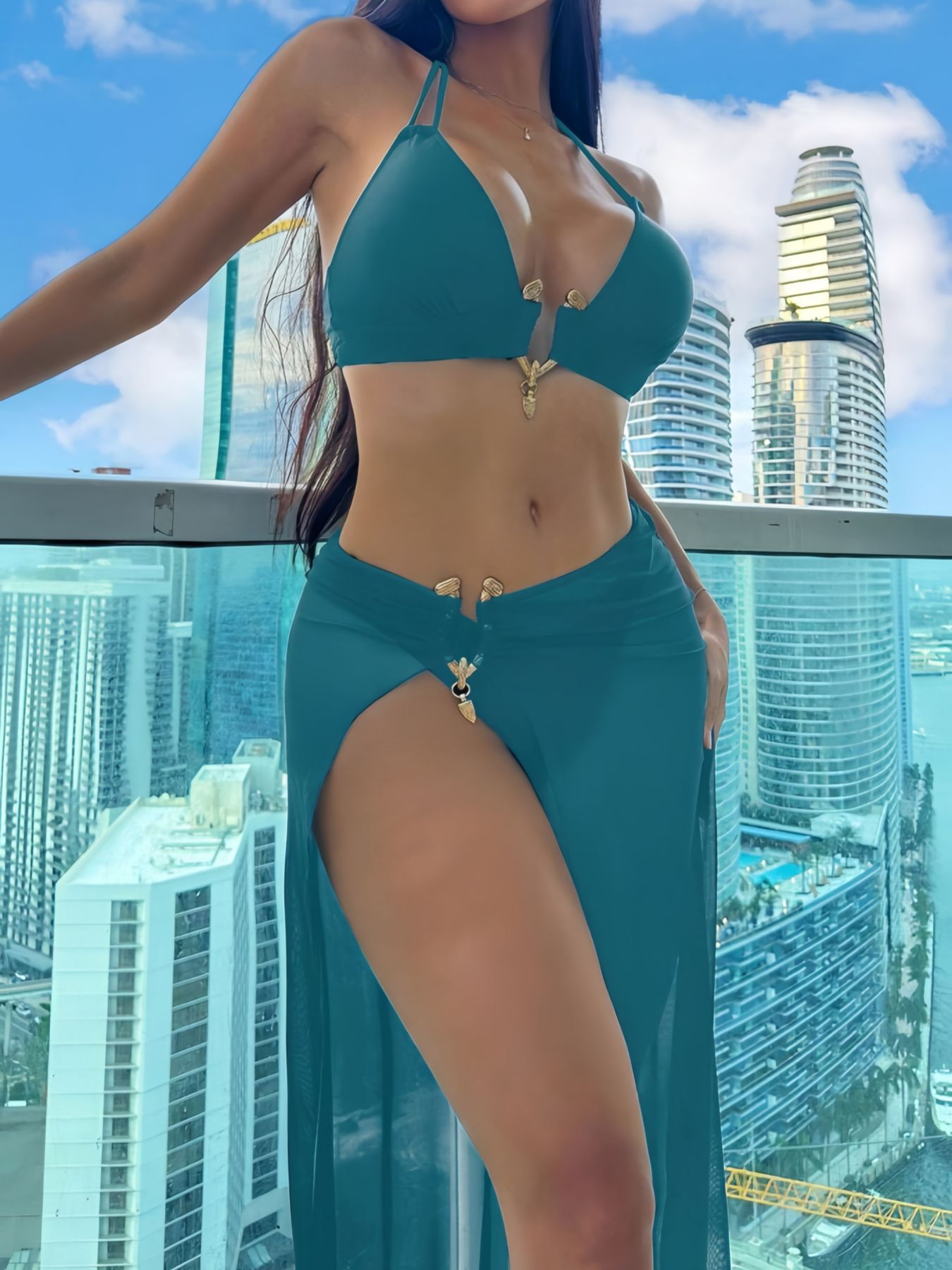 Трансграничный купальник Xingcheng завод новый европейский и американский женский набор из трех частей бикини длинное платье сплошной цвет сексуальный купальник