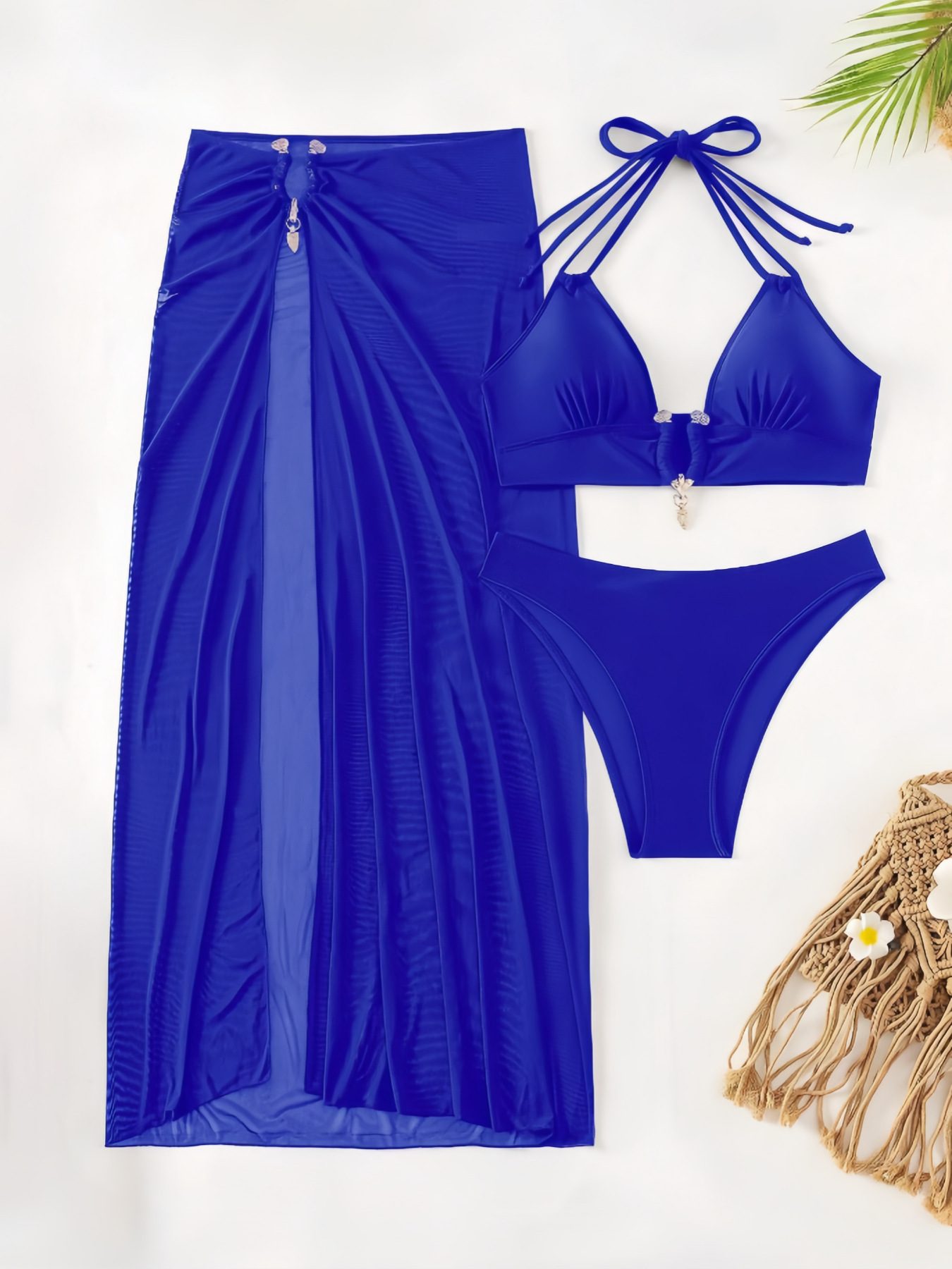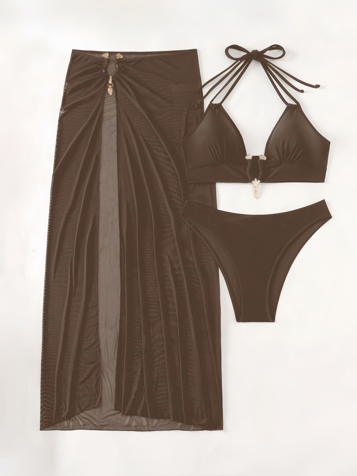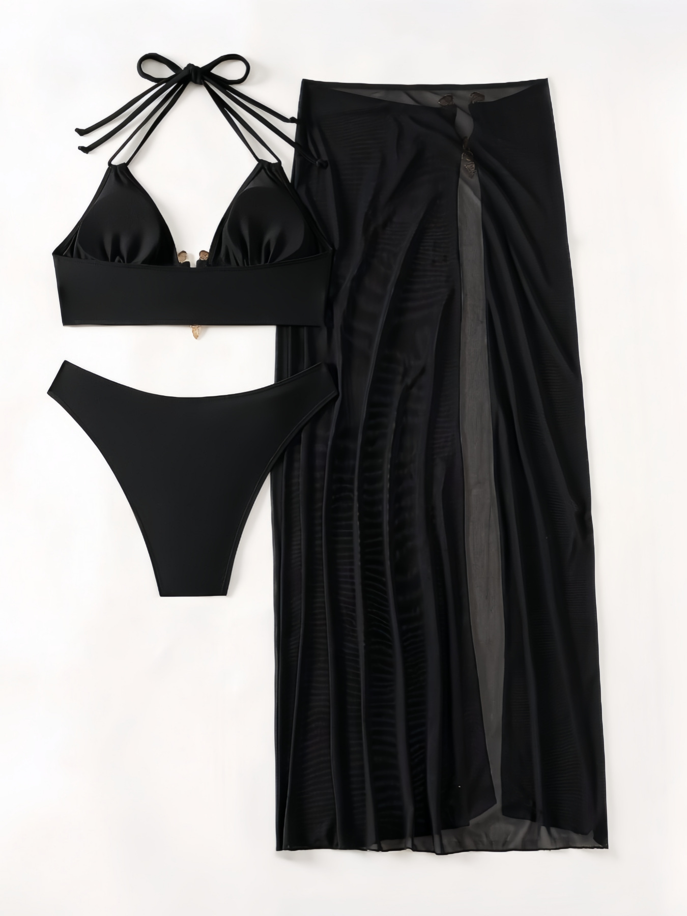 Трансграничный купальник Xingcheng завод новый европейский и американский женский набор из трех частей бикини длинное платье сплошной цвет сексуальный купальник