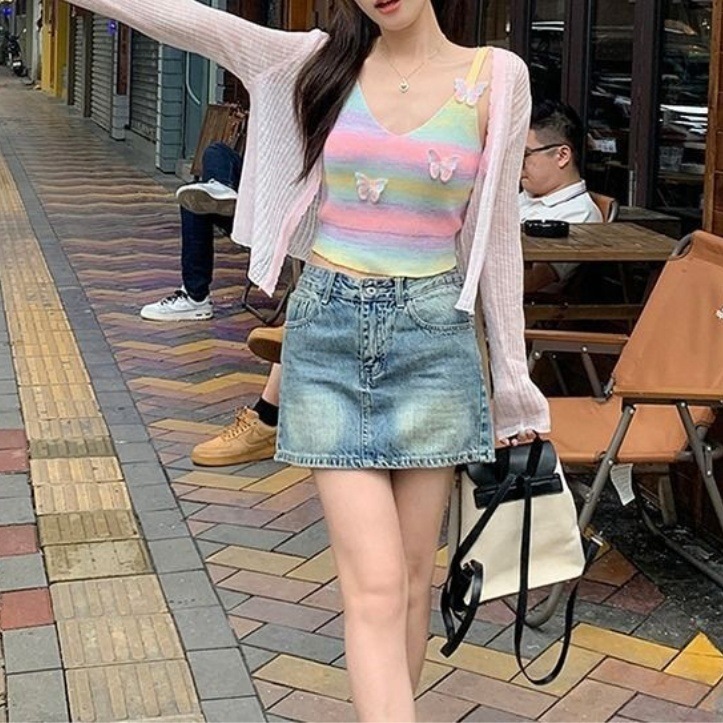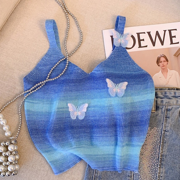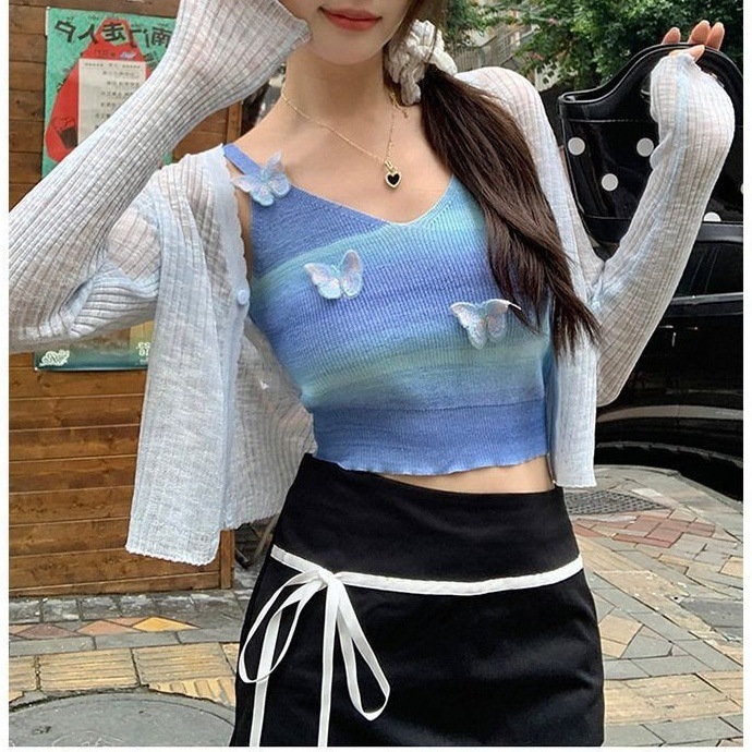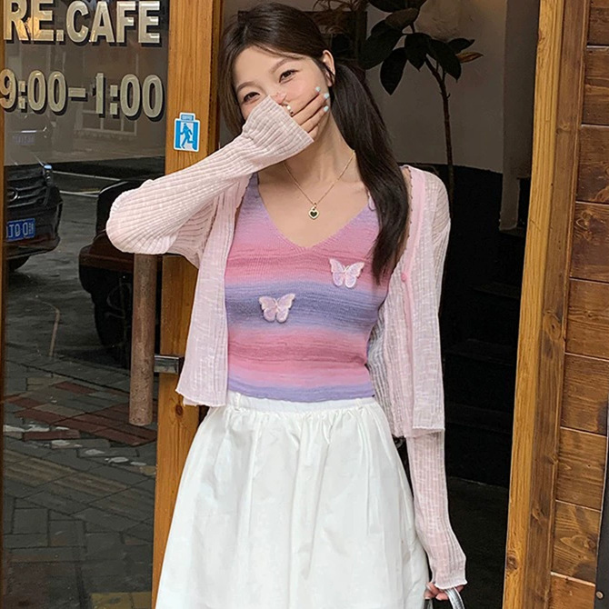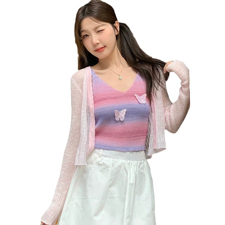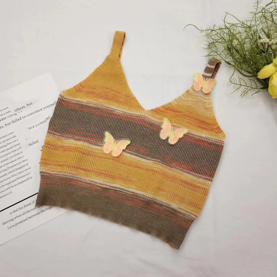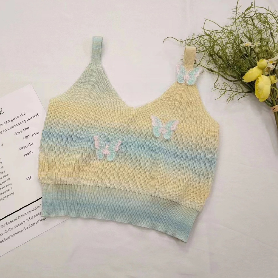 2024 корейский стиль, чистое желание, милая радужная бабочка, украшение, контрастный полосатый вязаный топ, летний топ для женщин