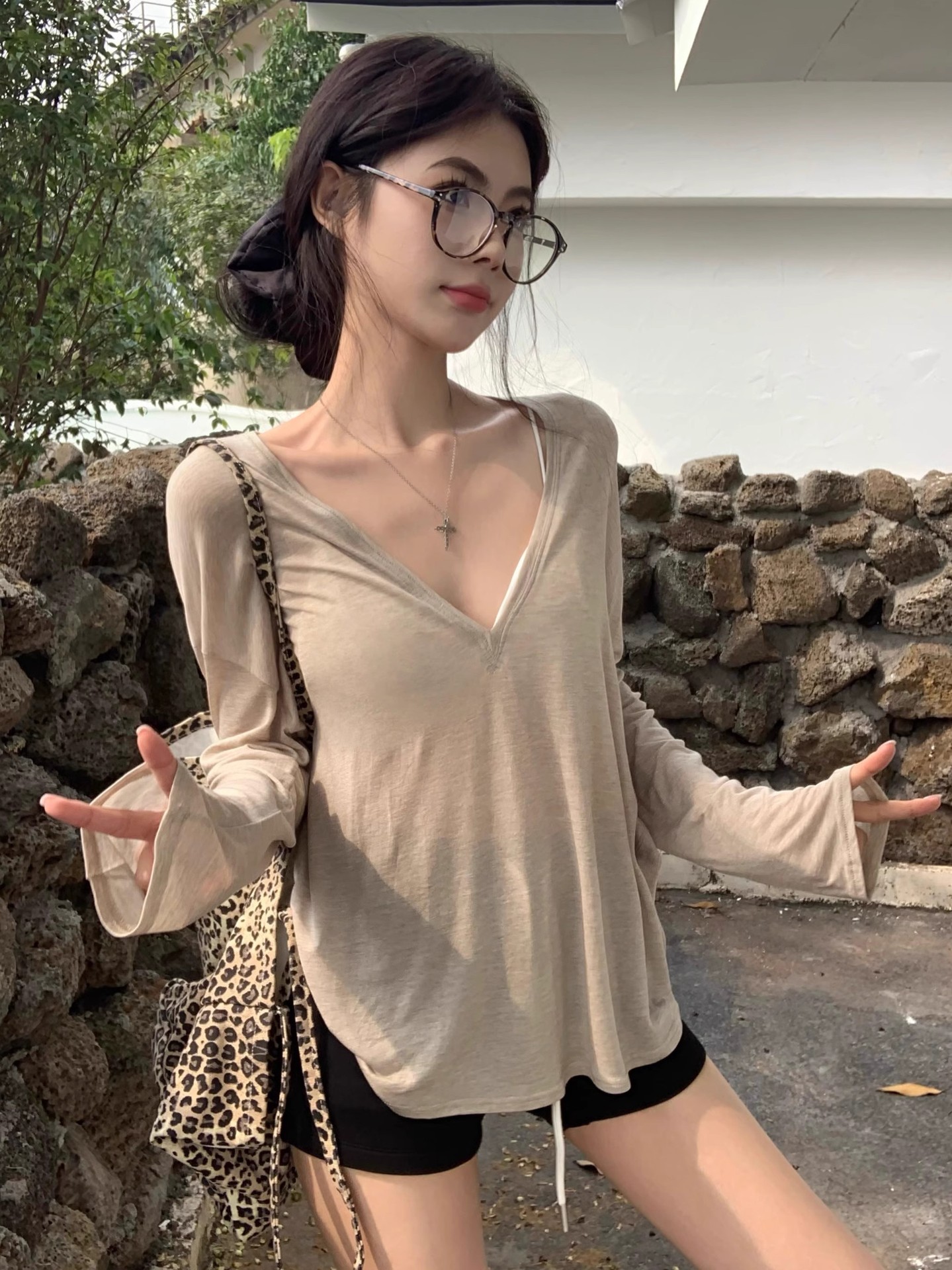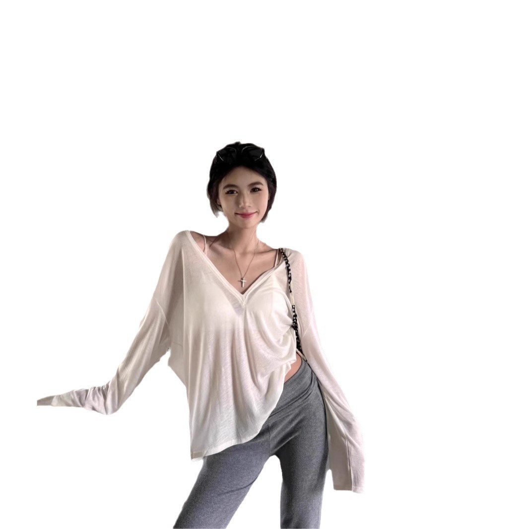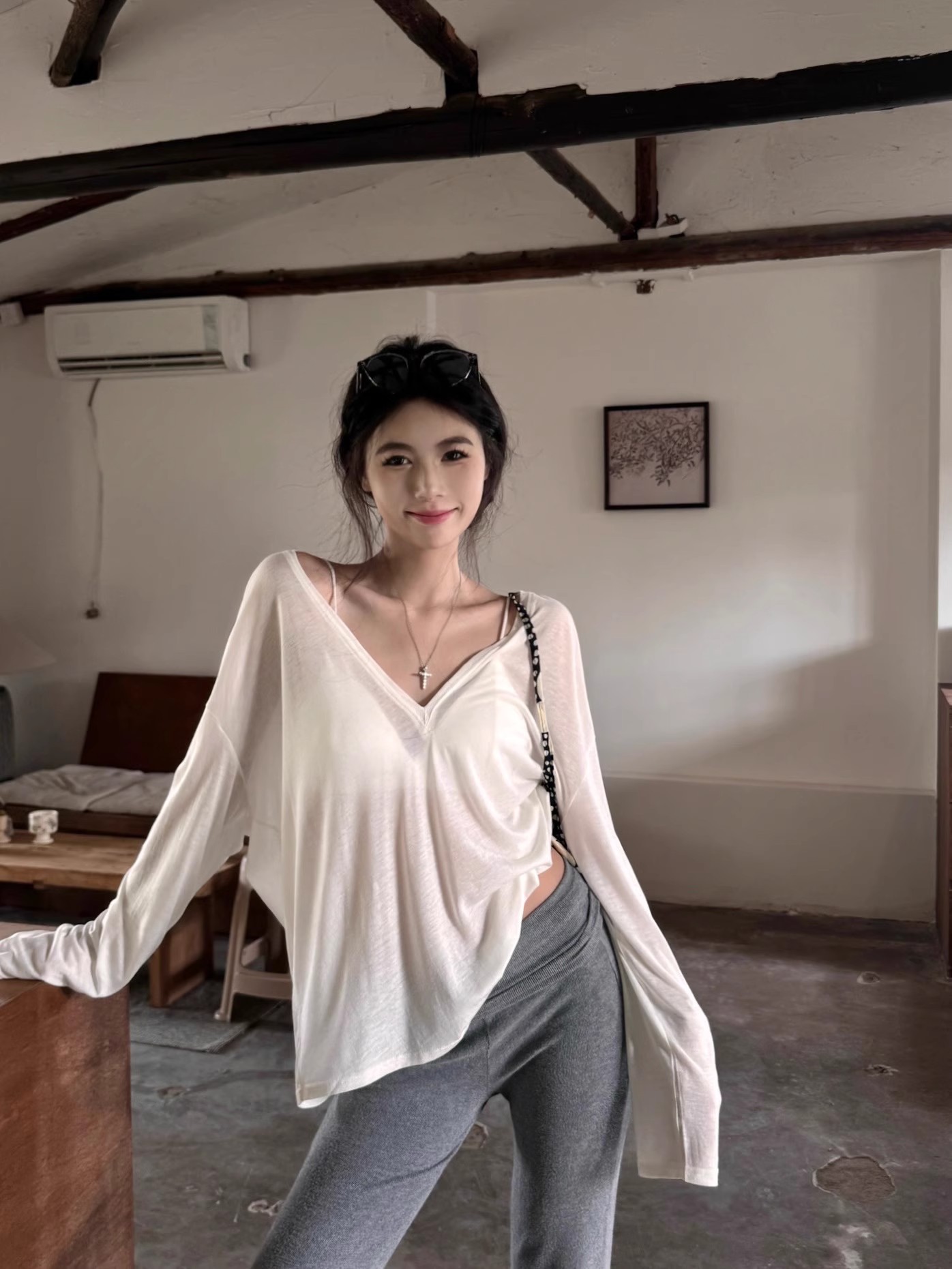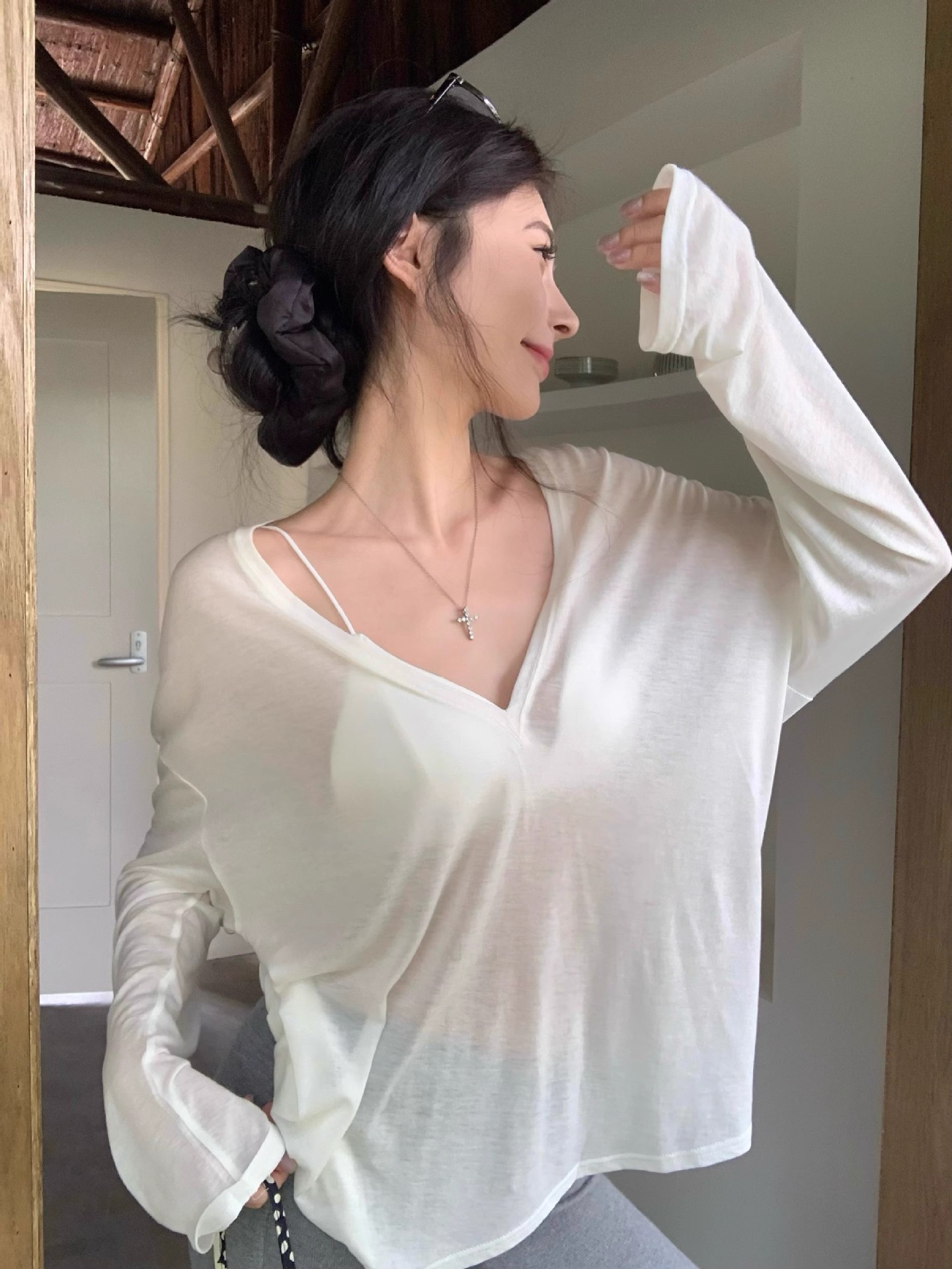 Слабая и ленивая белая солнцезащитная футболка с V-образным вырезом