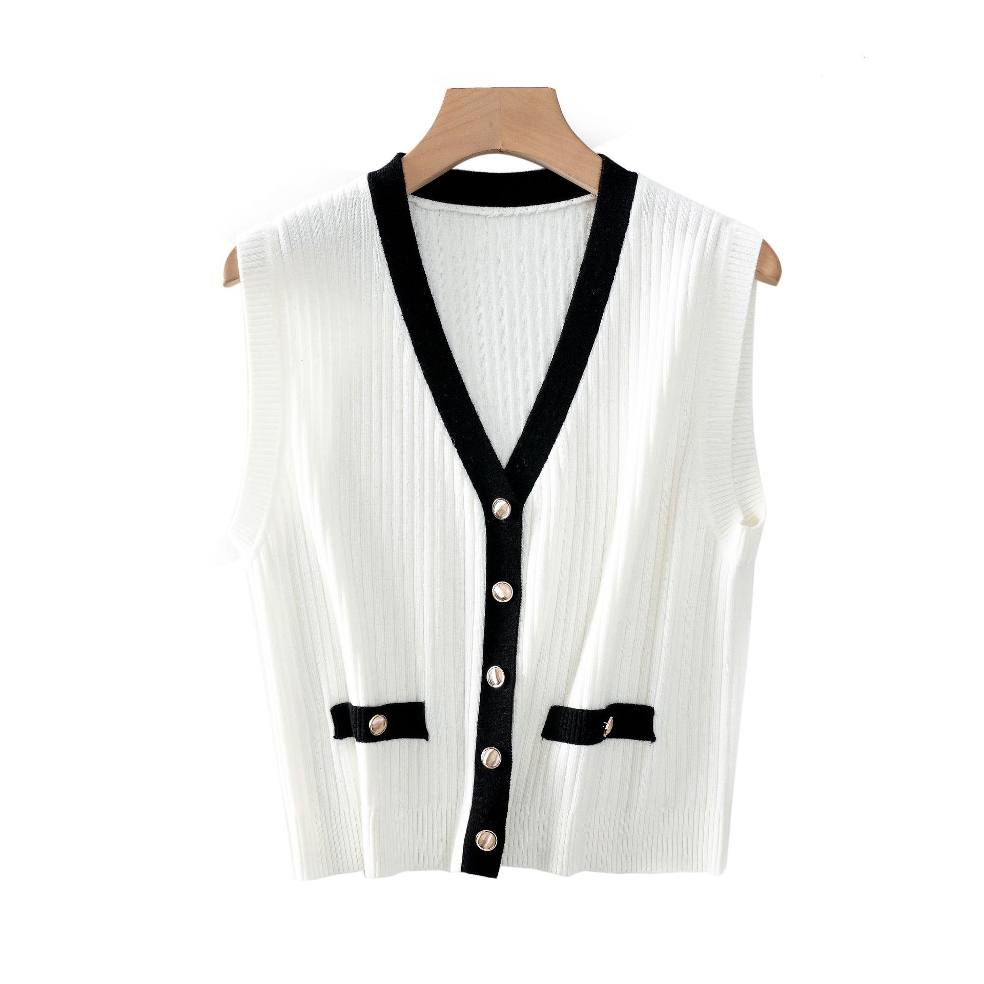 Шанциин; Кремово-белый; V-образный вырез в стиле Chanel, коричневый, свободный крой.; Белый объемный топ с V-образным вырезом в стиле Chanel; Жилет в стиле Chanel - Белый - 20
