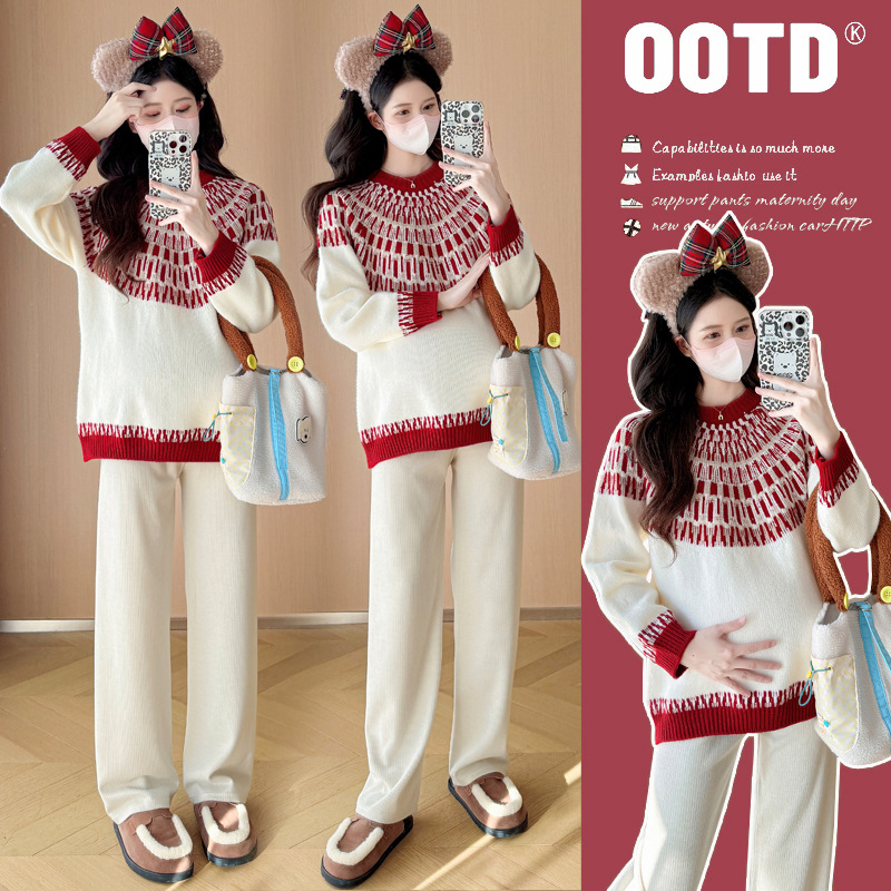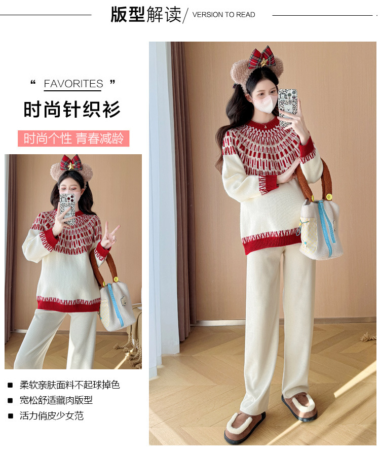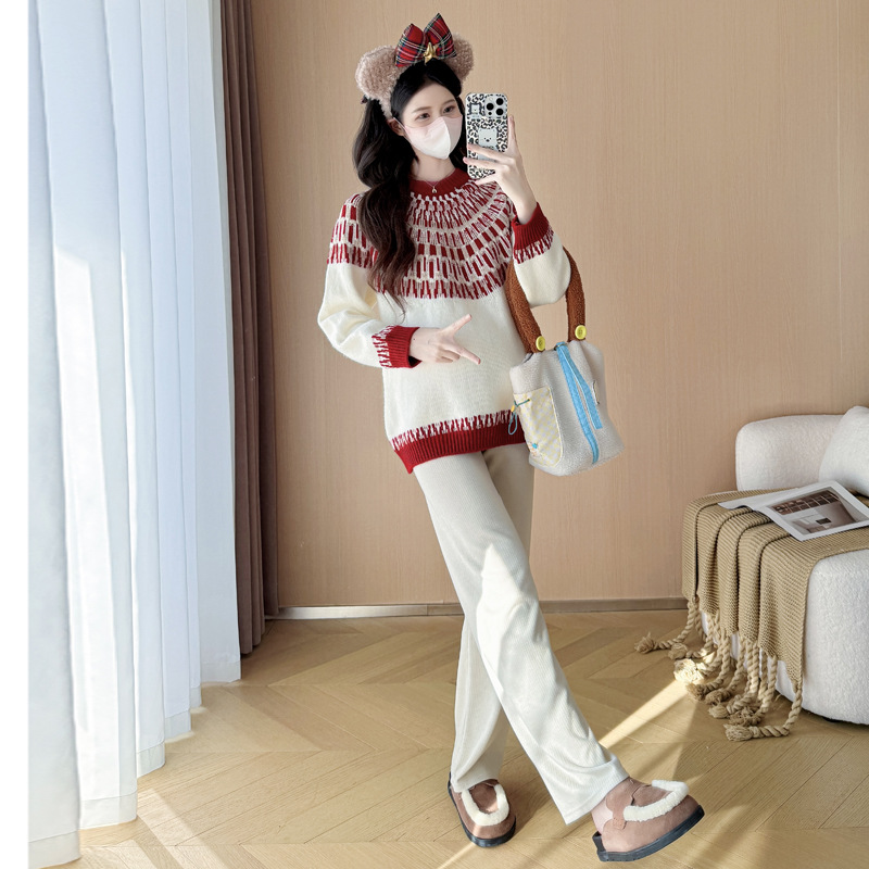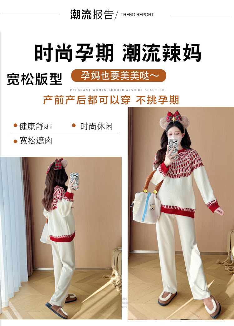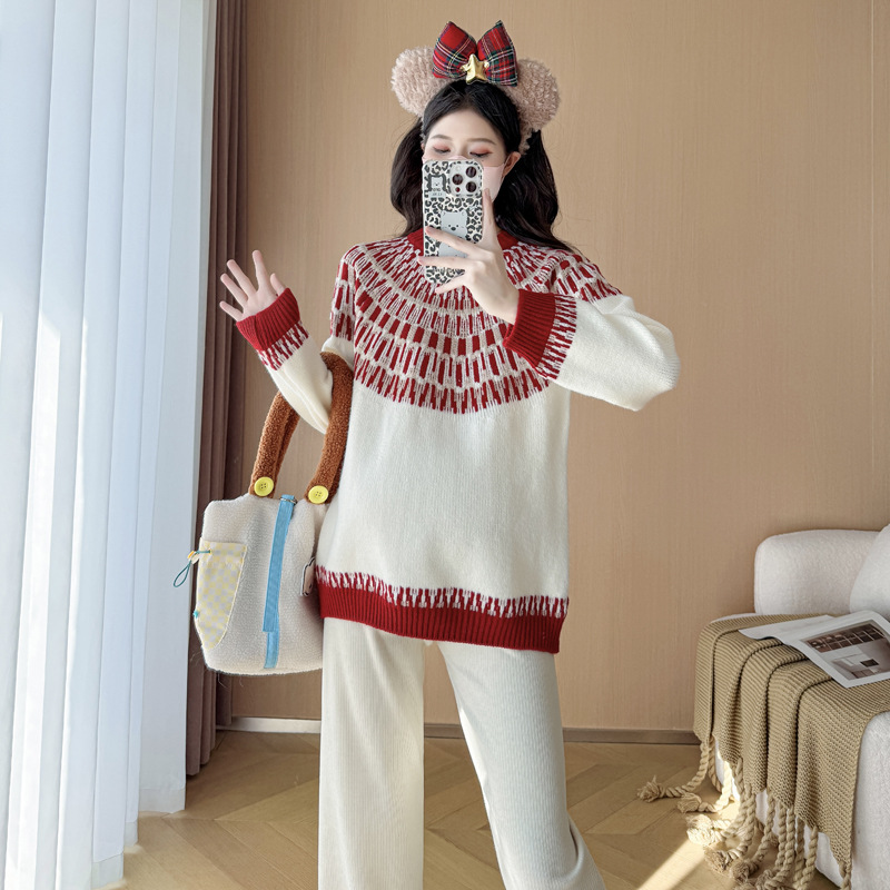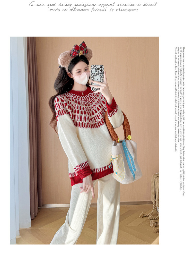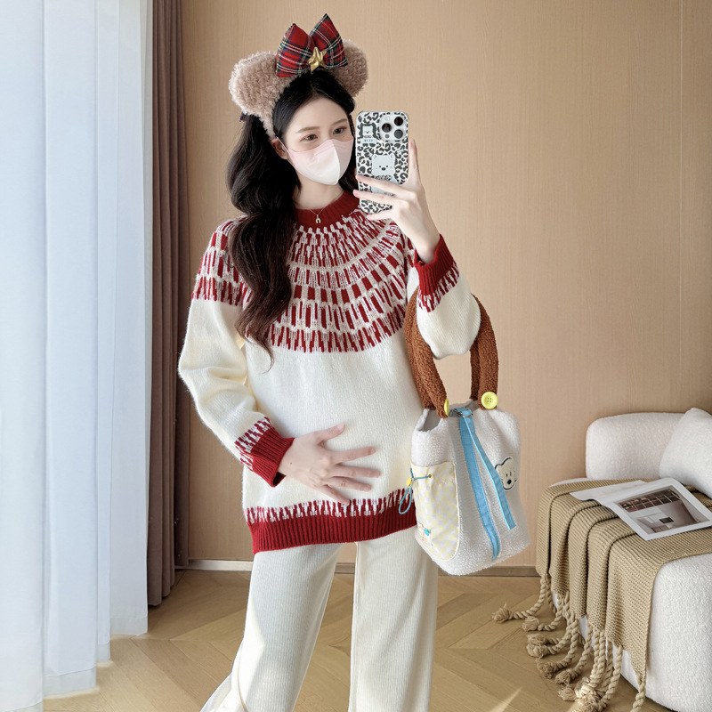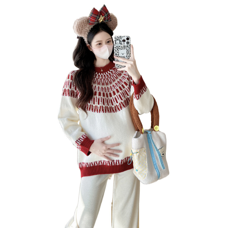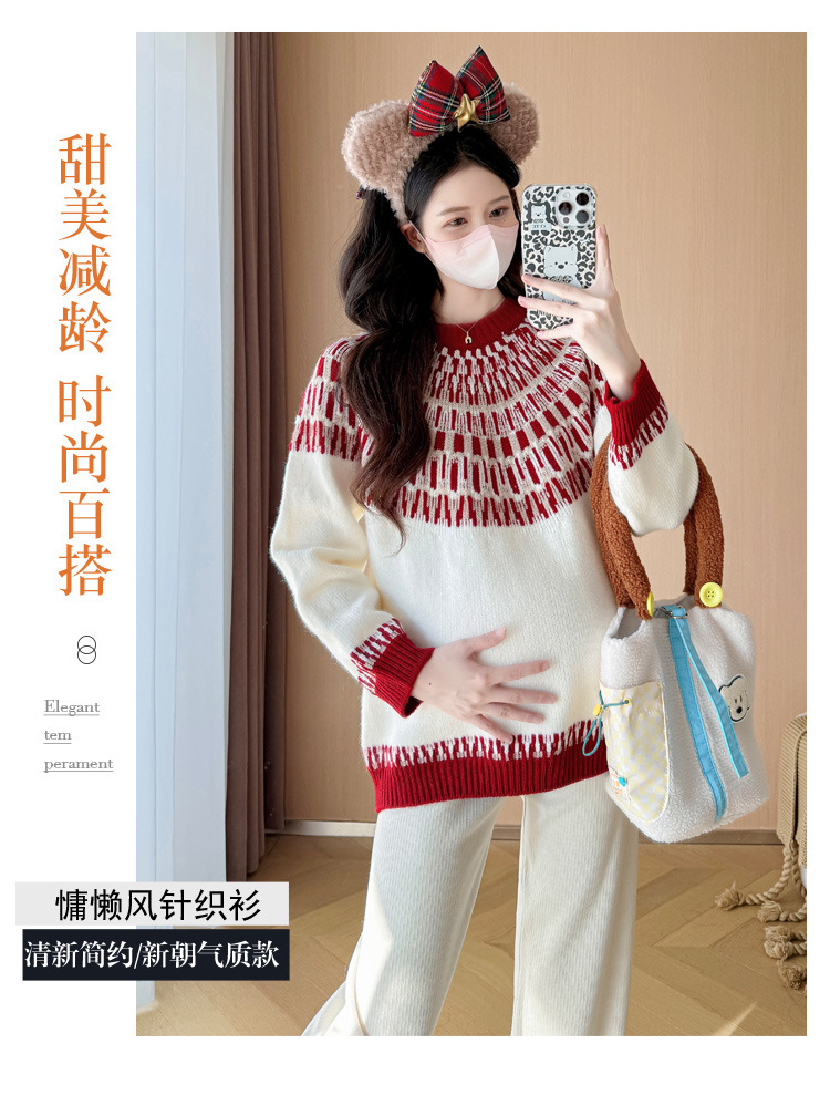 Новые осенне-зимние топы для беременных, свободный утепленный свитер в стиле ретро с жаккардовым узором для модных мам, китайский красный цвет к Новому году.