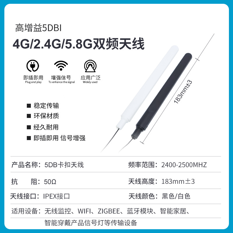 产品参数:5DB胶棒天线,适合如各种无线路由器,无线网卡等2.4G无线设备<img