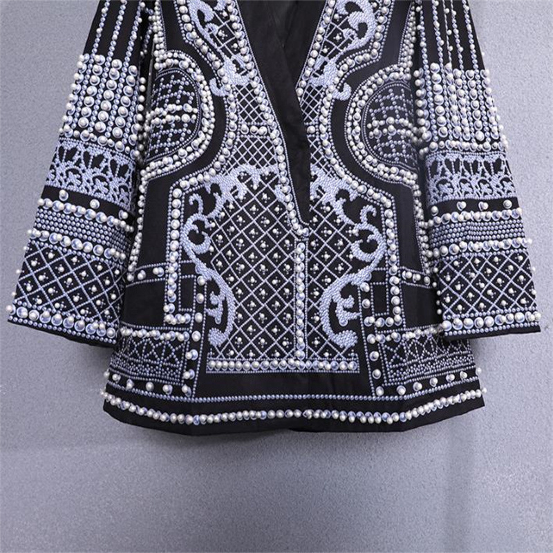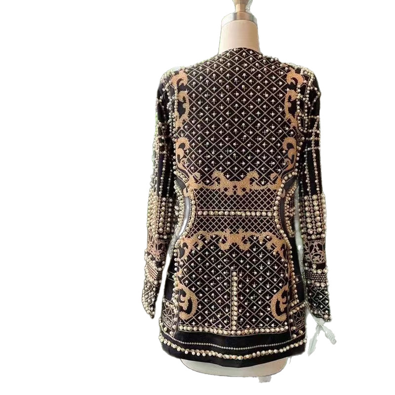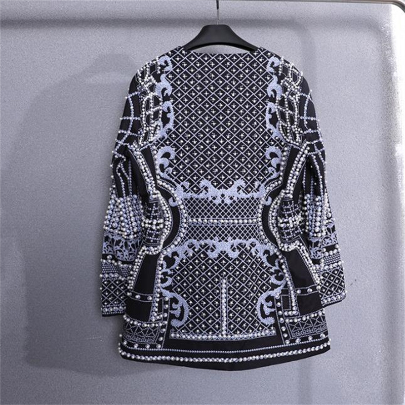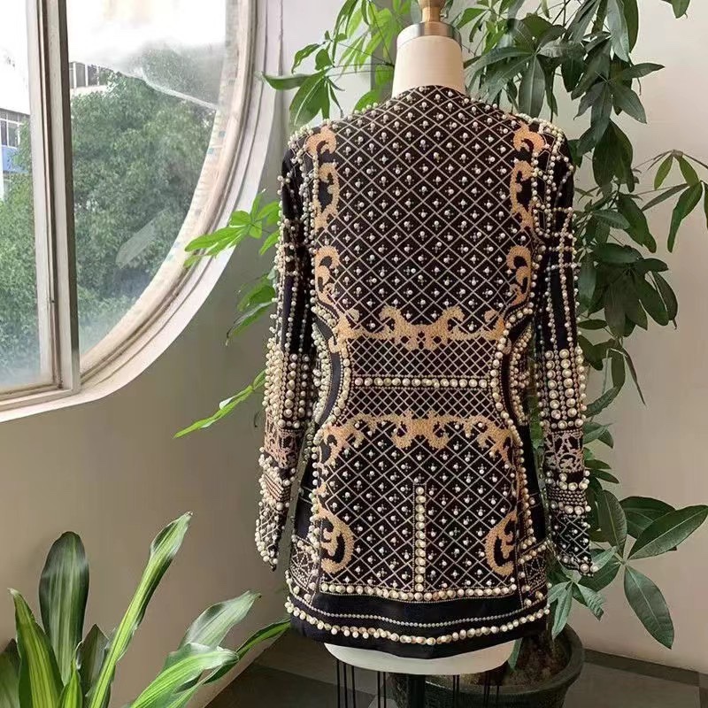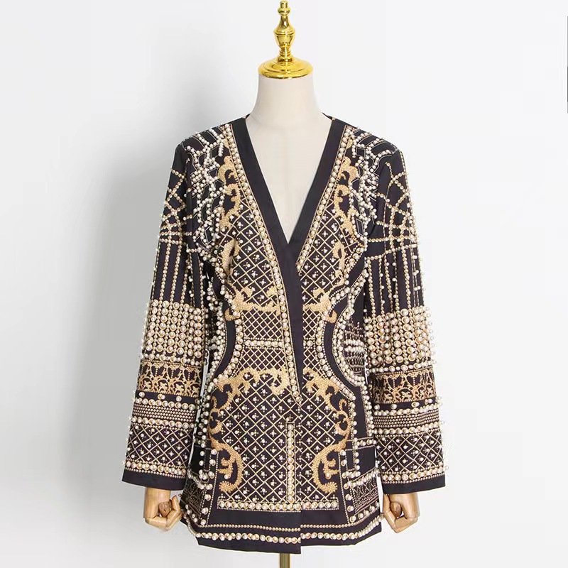 2025 французское ретро европейское и американское V-образный вырез с длинными рукавами толстый средний длинный костюм топ с пузырьком принтом бисер пиджак женский